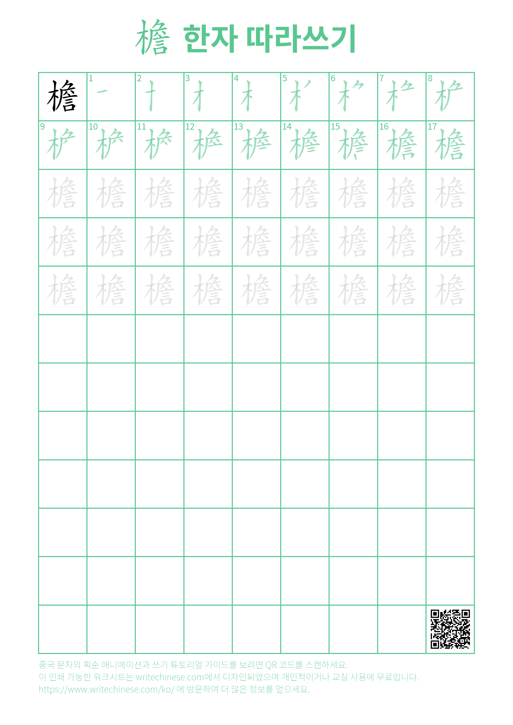 글씨 대가를 따라가며 '檐' 문자를 단계별로 쓰는 방법을 익혀 보세요. 캘리그라피 선생님과 함께하는 비디오 튜토리얼을 통해 중국 문자 '檐'의 올바른 쓰기 방법을 배울 수 있습니다. 아래 링크에서 인쇄용 필기 연습지를 다운로드하여 종이와 펜과 함께 연습해 보세요.