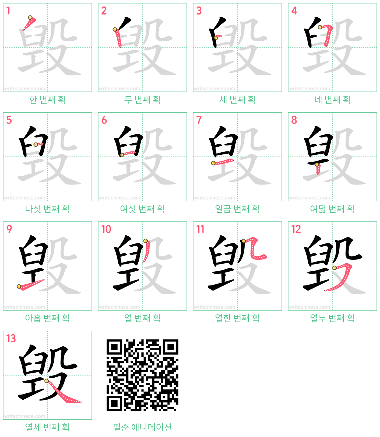 한 획 한 획: 毁의 쓰기 순서. 시각적인 단계별 안내를 통해 중국 문자 '毁'의 획을 하나씩 익혀 보세요.