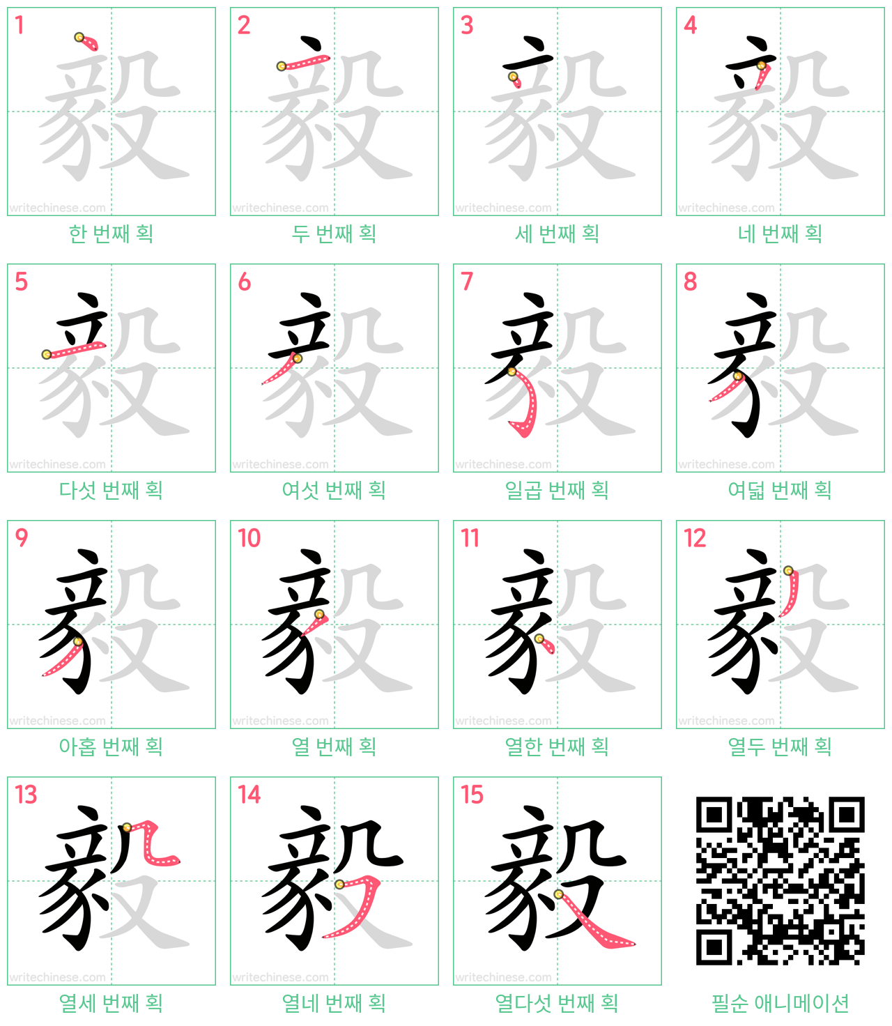 한 획 한 획: 毅의 쓰기 순서. 시각적인 단계별 안내를 통해 중국 문자 '毅'의 획을 하나씩 익혀 보세요.
