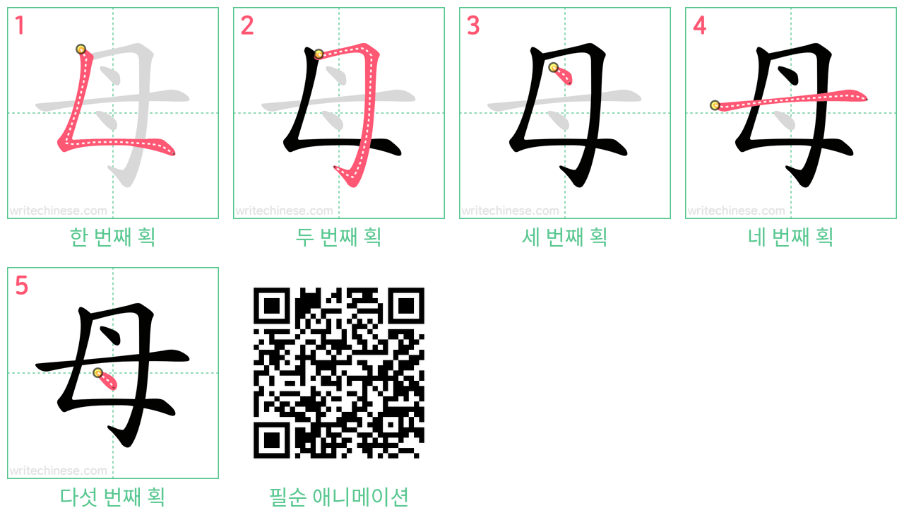 "母"의 획순 애니메이션을 보면서 중국 문자 "母"을 쓰는 법을 배워 보세요.