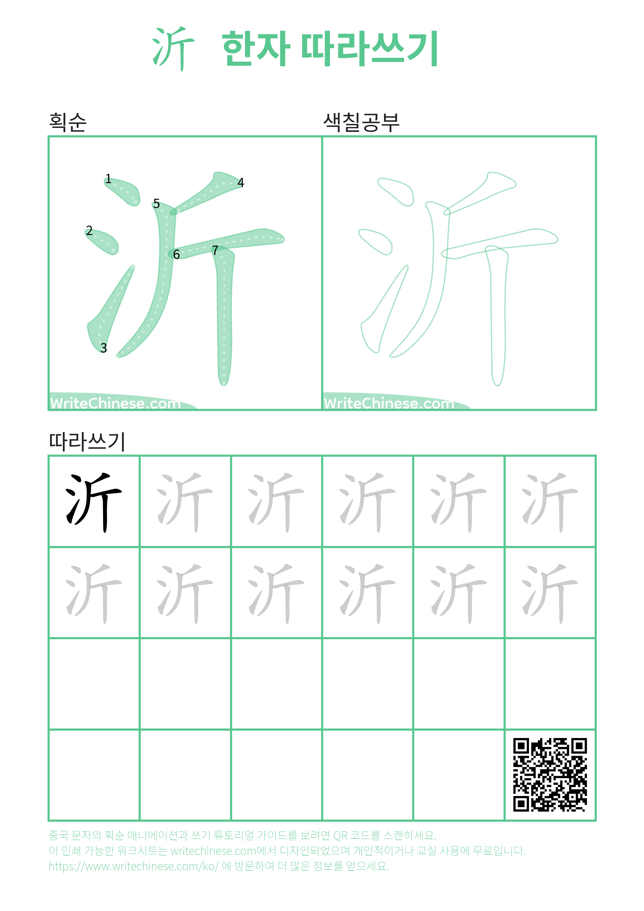 한 획 한 획: 沂의 쓰기 순서. 시각적인 단계별 안내를 통해 중국 문자 '沂'의 획을 하나씩 익혀 보세요.