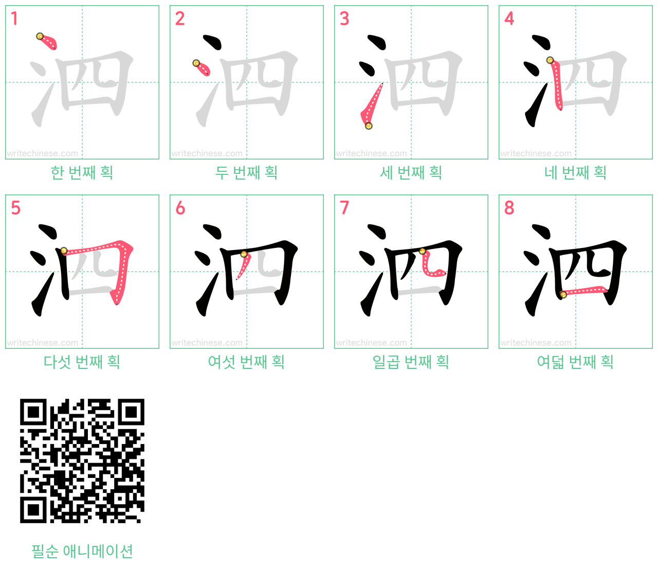 한 획 한 획: 泗의 쓰기 순서. 시각적인 단계별 안내를 통해 중국 문자 '泗'의 획을 하나씩 익혀 보세요.