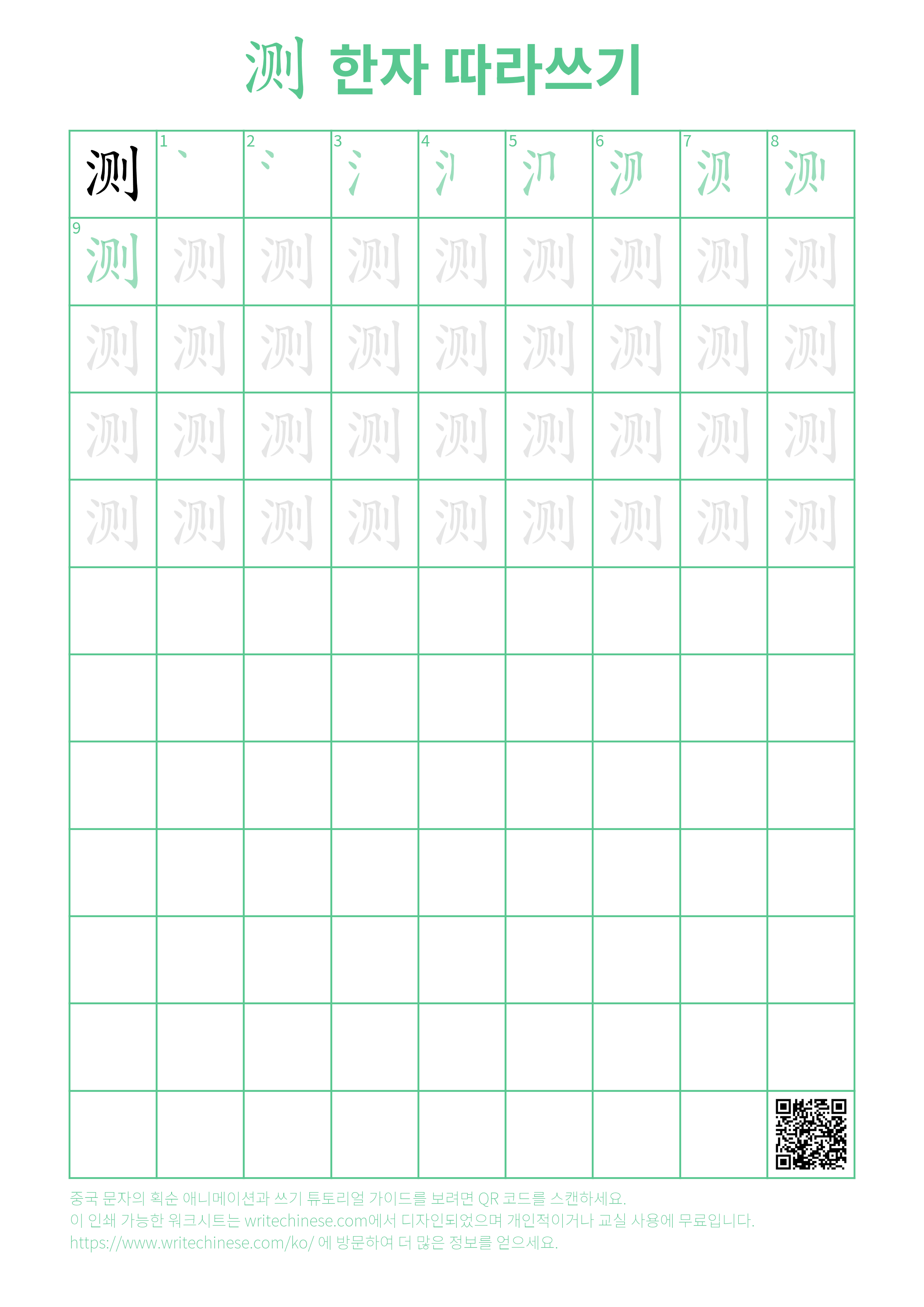 한 획 한 획: 测의 쓰기 순서. 시각적인 단계별 안내를 통해 중국 문자 '测'의 획을 하나씩 익혀 보세요.
