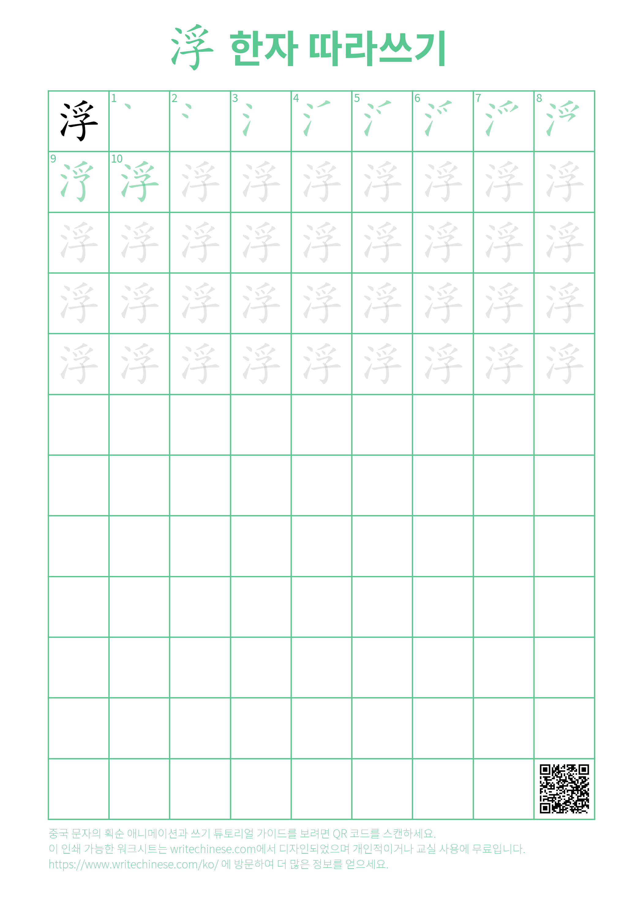 글씨 대가를 따라가며 '浮' 문자를 단계별로 쓰는 방법을 익혀 보세요. 캘리그라피 선생님과 함께하는 비디오 튜토리얼을 통해 중국 문자 '浮'의 올바른 쓰기 방법을 배울 수 있습니다. 아래 링크에서 인쇄용 필기 연습지를 다운로드하여 종이와 펜과 함께 연습해 보세요.