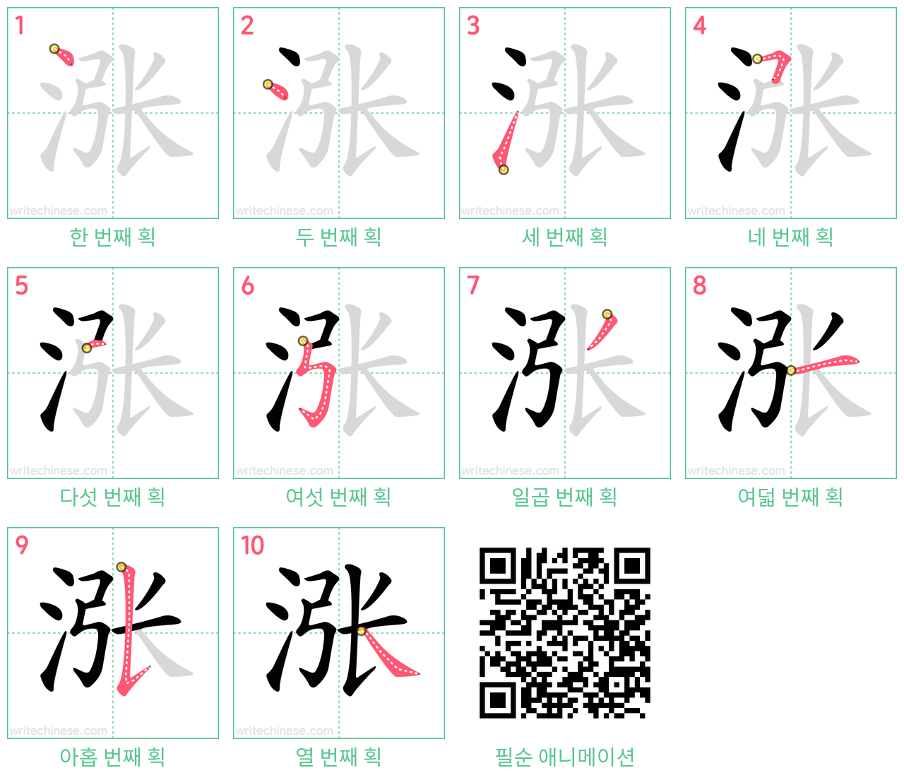 한 획 한 획: 涨의 쓰기 순서. 시각적인 단계별 안내를 통해 중국 문자 '涨'의 획을 하나씩 익혀 보세요.