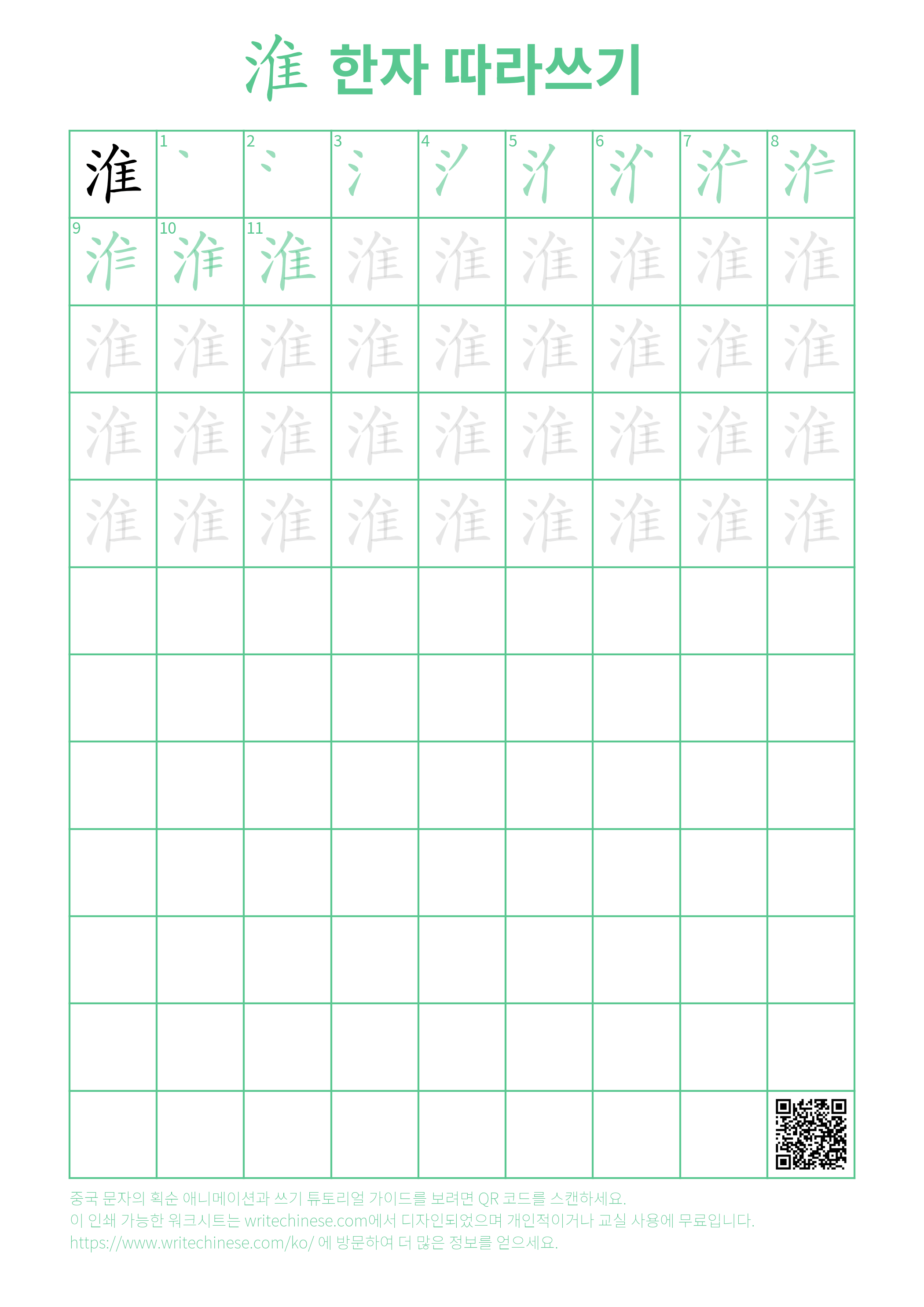 1. 〔~河〕수명, 중국 河南省의 桐柏山에서 시작하여 安徽, 江苏 두 성을 흐르다가 洪泽湖에 들어간다. 약칭은 '淮'이며, 예를 들어 '~北', '~南'이다.