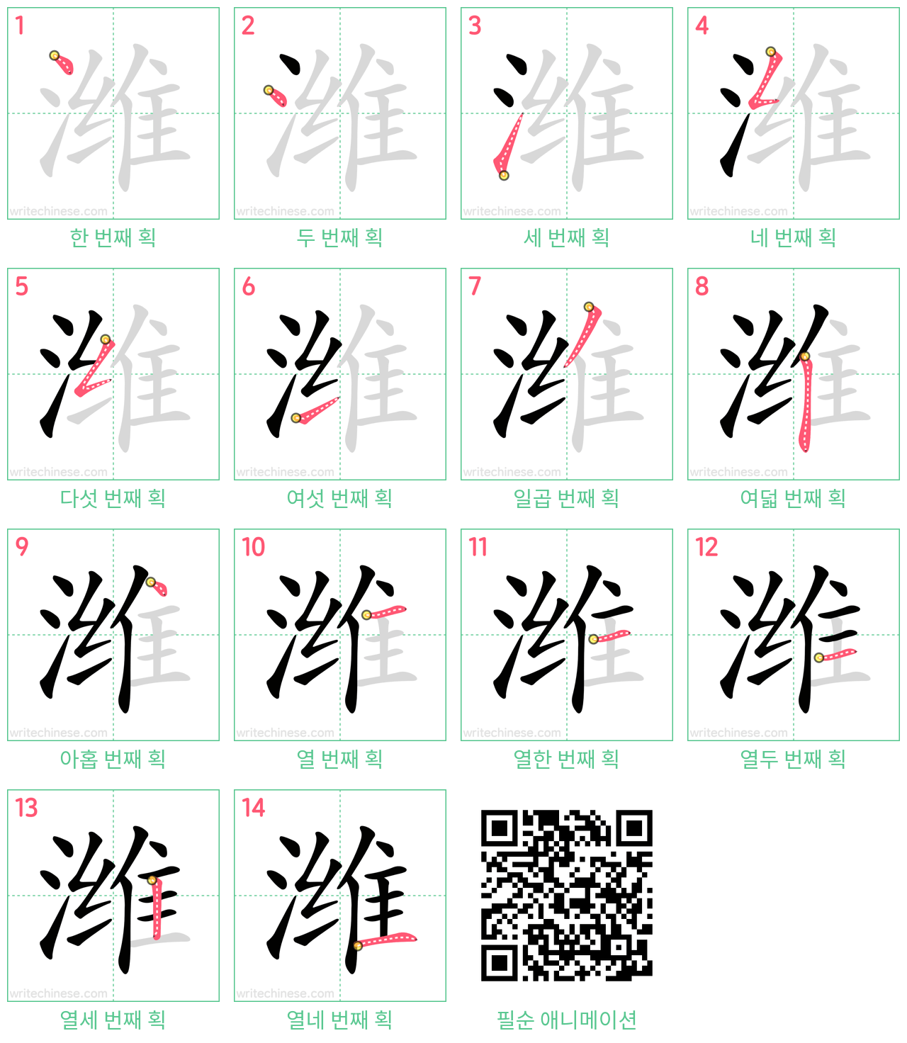 한 획 한 획: 潍의 쓰기 순서. 시각적인 단계별 안내를 통해 중국 문자 '潍'의 획을 하나씩 익혀 보세요.