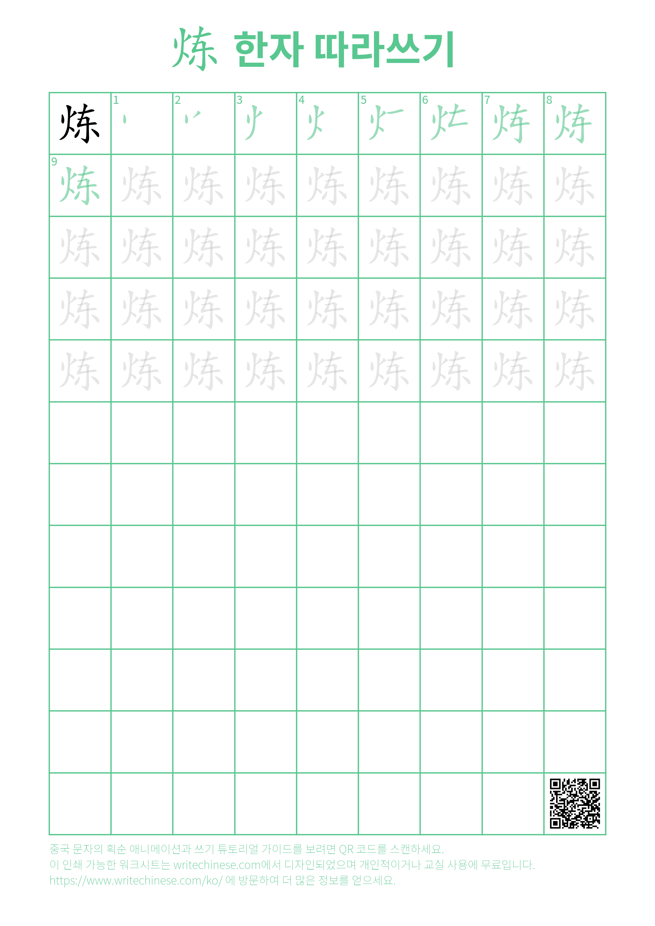 글씨 대가를 따라가며 '炼' 문자를 단계별로 쓰는 방법을 익혀 보세요. 캘리그라피 선생님과 함께하는 비디오 튜토리얼을 통해 중국 문자 '炼'의 올바른 쓰기 방법을 배울 수 있습니다. 아래 링크에서 인쇄용 필기 연습지를 다운로드하여 종이와 펜과 함께 연습해 보세요.
