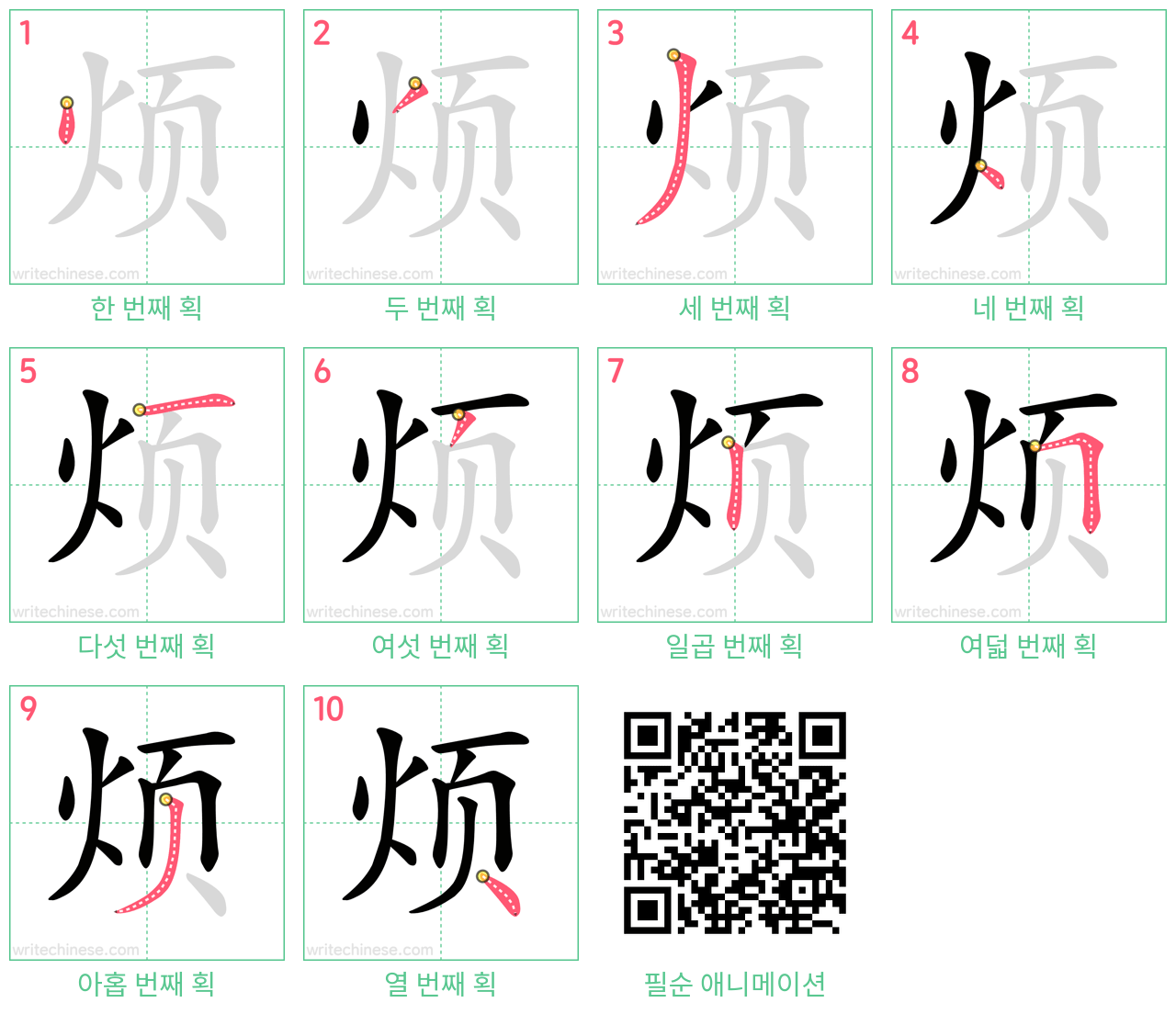 "烦"의 획순 애니메이션을 보면서 중국 문자 "烦"을 쓰는 법을 배워 보세요.