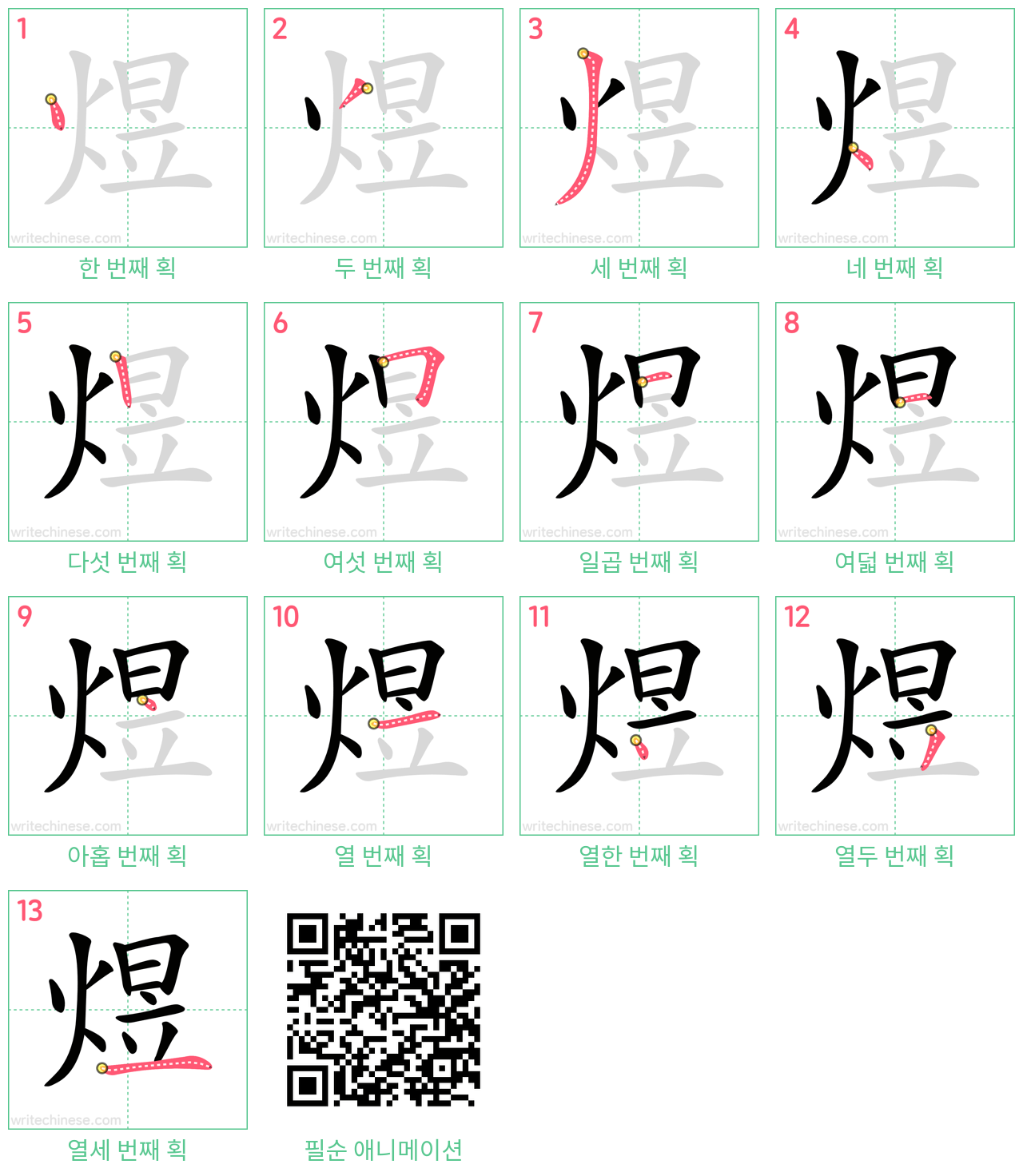 한 획 한 획: 煜의 쓰기 순서. 시각적인 단계별 안내를 통해 중국 문자 '煜'의 획을 하나씩 익혀 보세요.