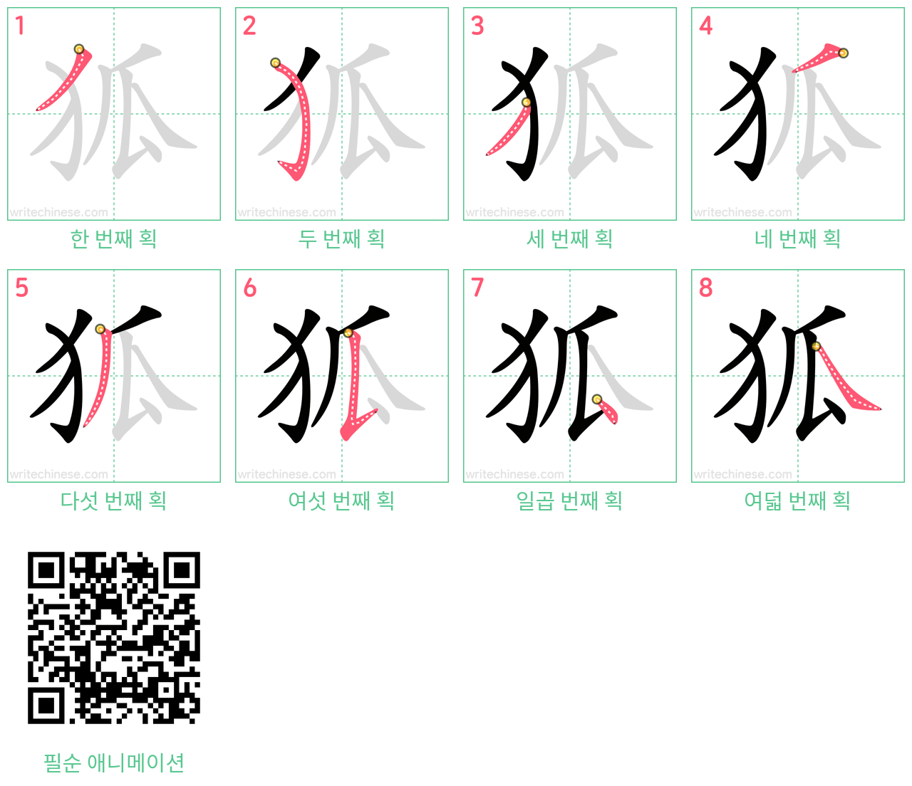 狐의 획순 연습용 인쇄 가능한 연습지입니다