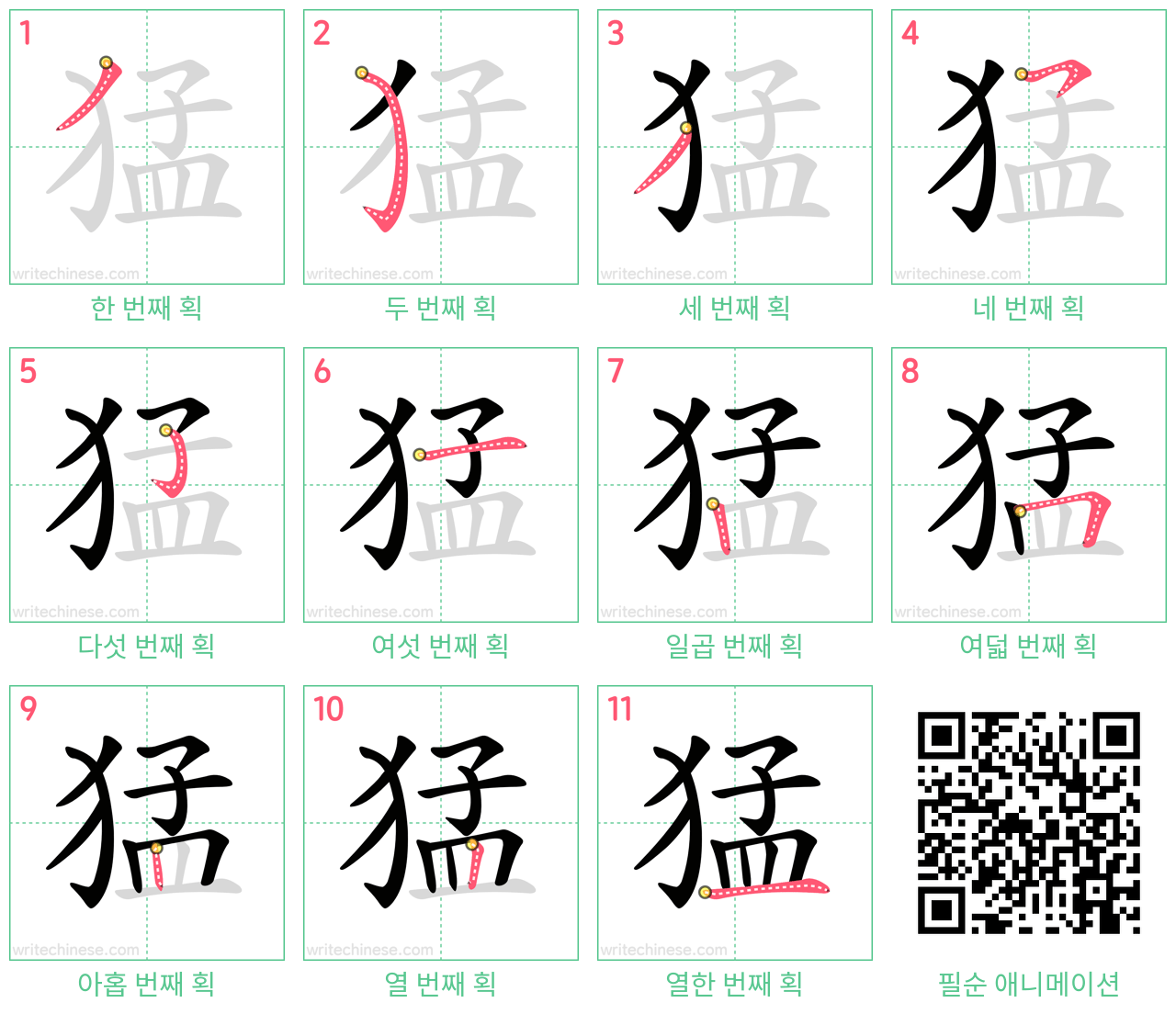 "猛"의 획순 애니메이션을 보면서 중국 문자 "猛"을 쓰는 법을 배워 보세요.