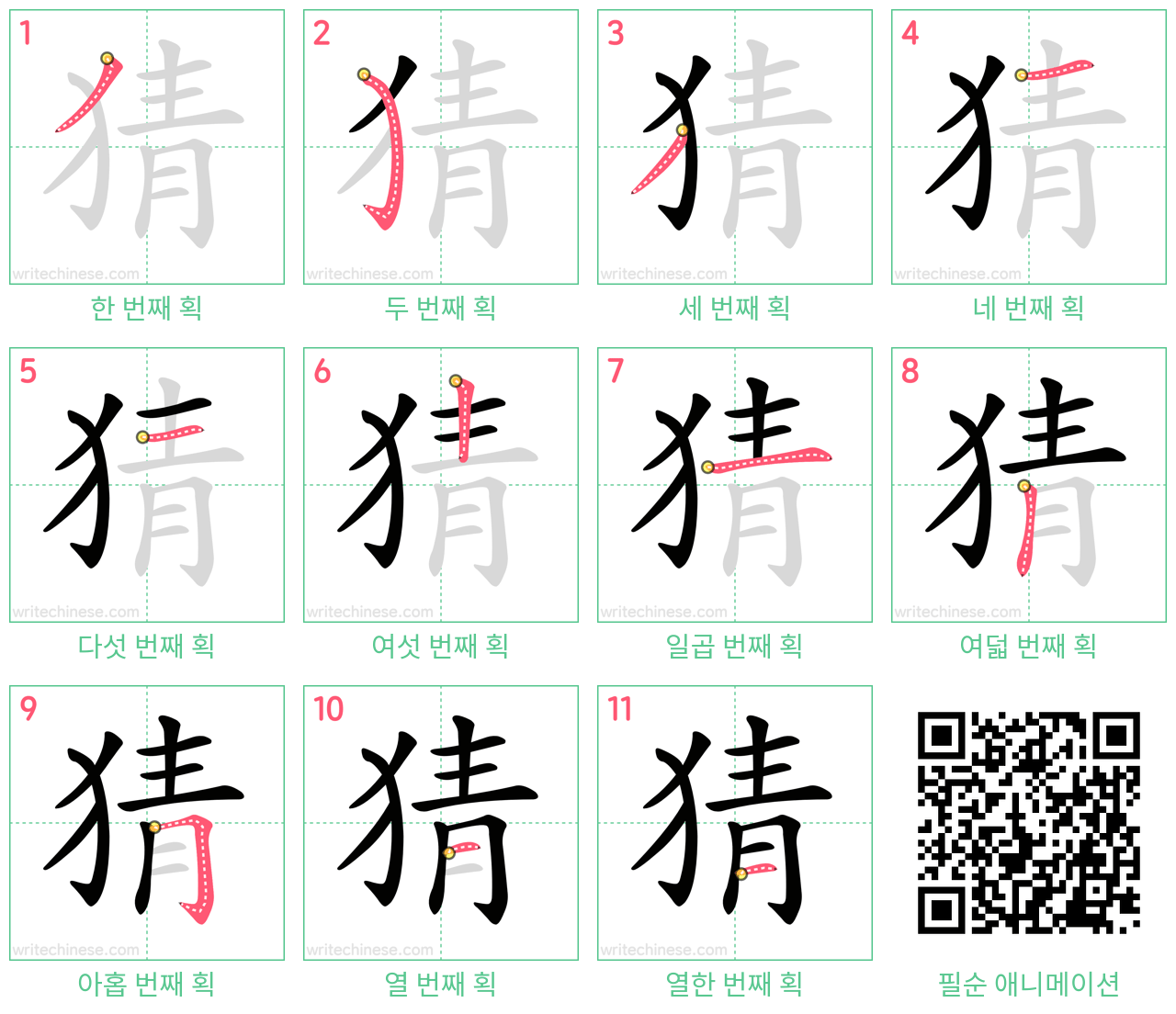 한 획 한 획: 猜의 쓰기 순서. 시각적인 단계별 안내를 통해 중국 문자 '猜'의 획을 하나씩 익혀 보세요.