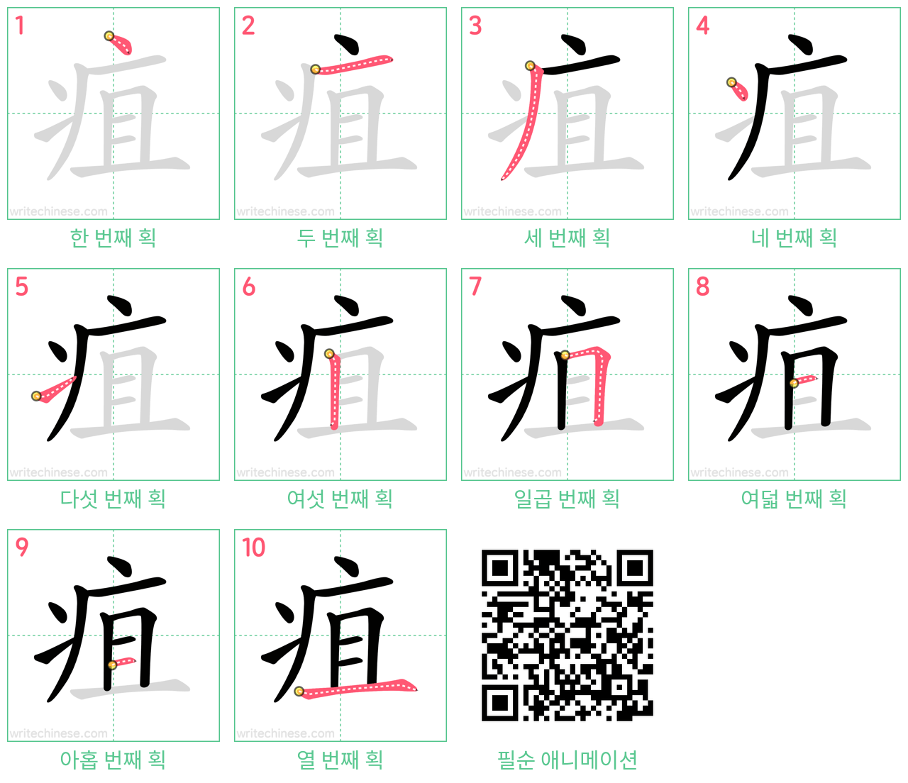 "疽"의 획순 애니메이션을 보면서 중국 문자 "疽"을 쓰는 법을 배워 보세요.