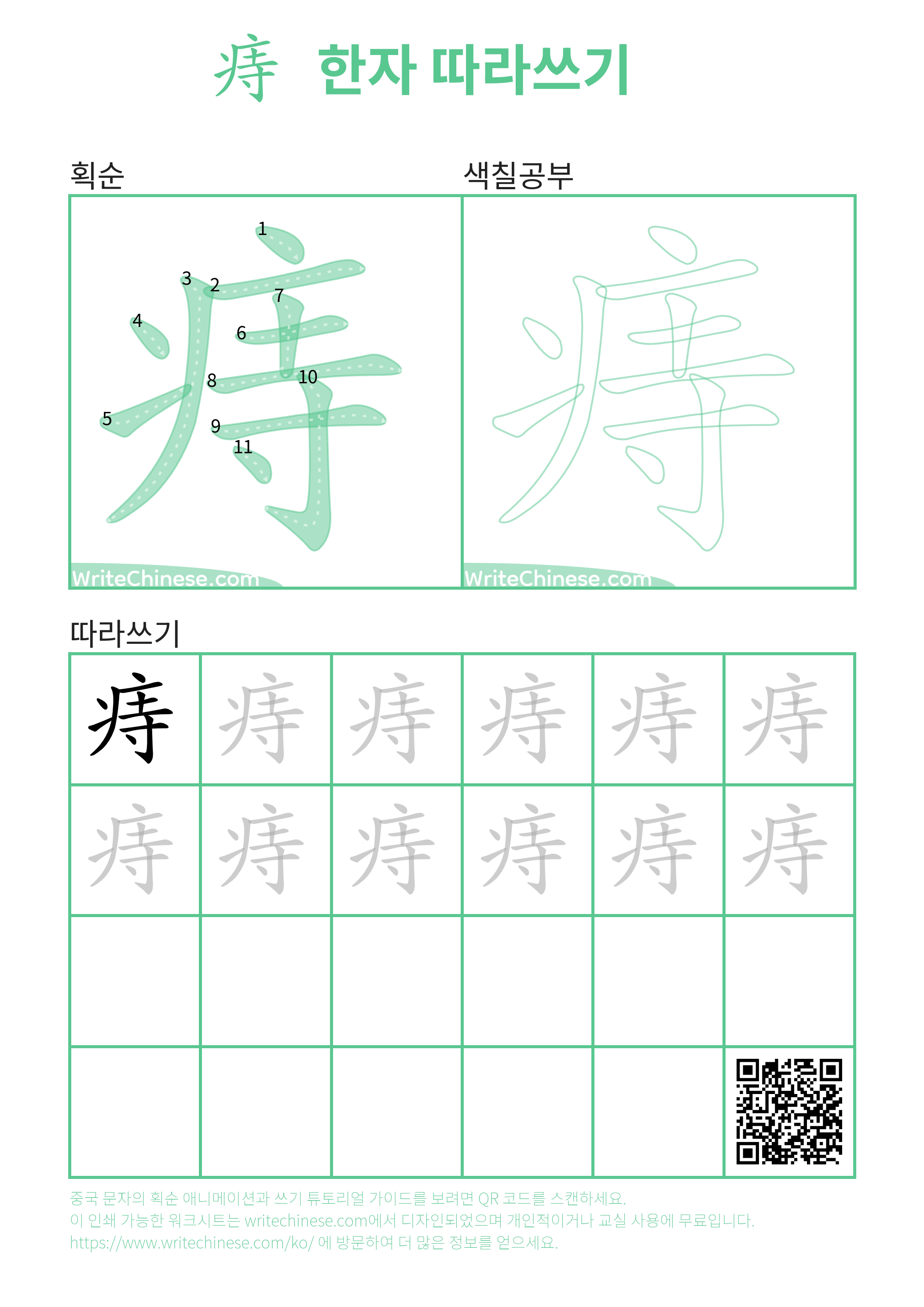 "痔"의 획순 애니메이션을 보면서 중국 문자 "痔"을 쓰는 법을 배워 보세요.