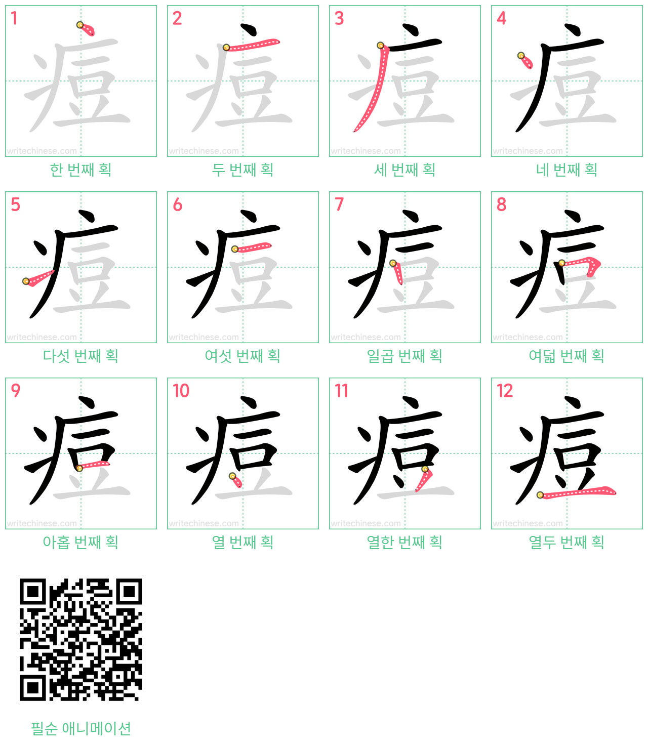 한 획 한 획: 痘의 쓰기 순서. 시각적인 단계별 안내를 통해 중국 문자 '痘'의 획을 하나씩 익혀 보세요.