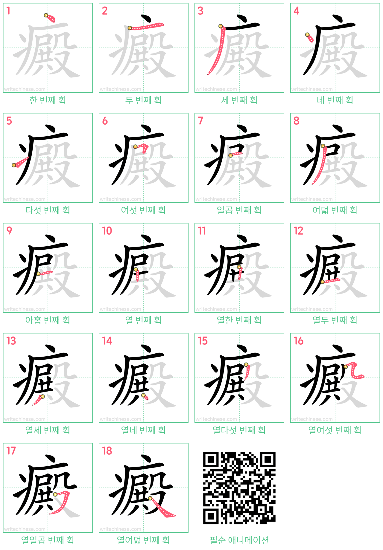 한 획 한 획: 癜의 쓰기 순서. 시각적인 단계별 안내를 통해 중국 문자 '癜'의 획을 하나씩 익혀 보세요.
