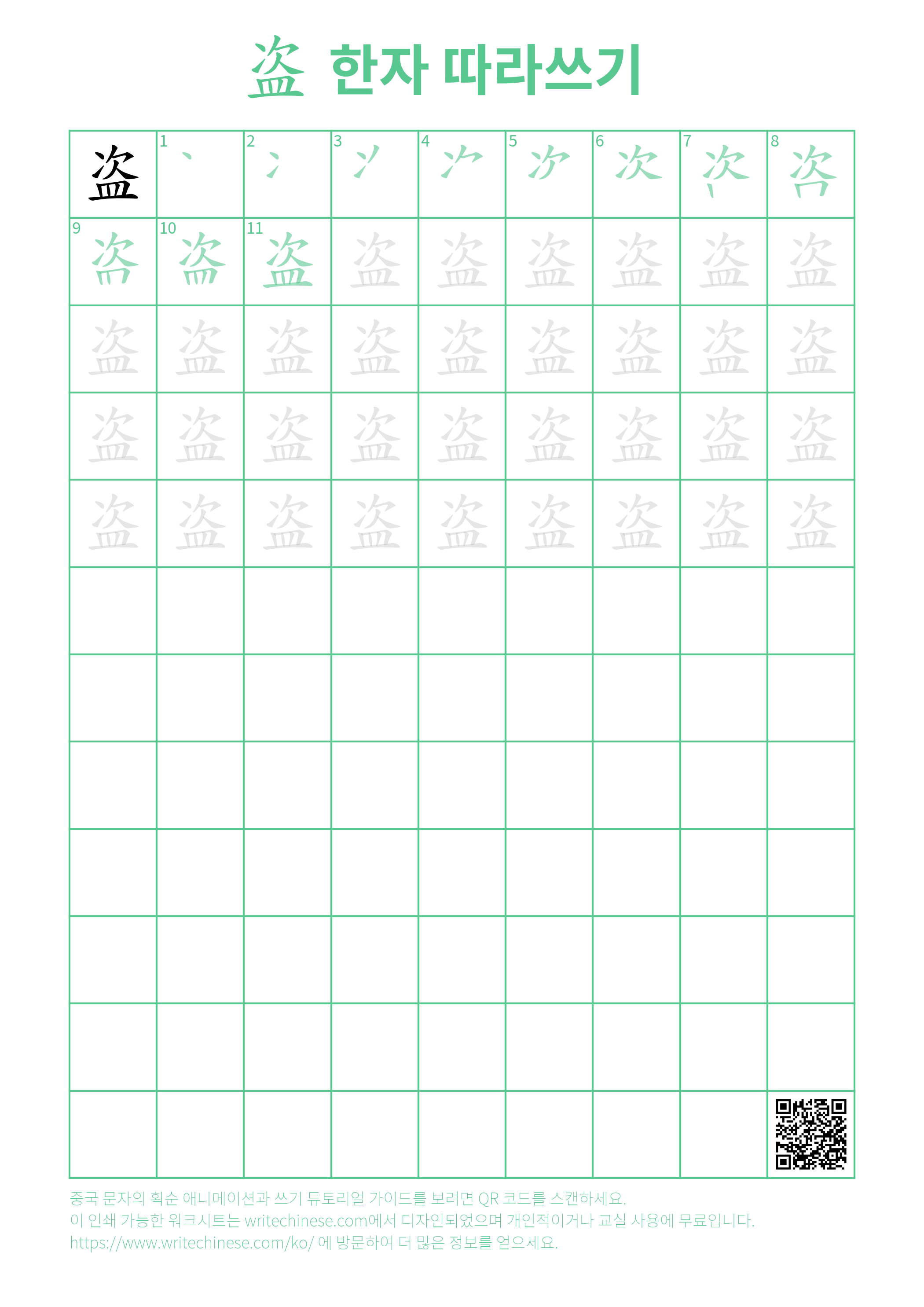 한 획 한 획: 盗의 쓰기 순서. 시각적인 단계별 안내를 통해 중국 문자 '盗'의 획을 하나씩 익혀 보세요.