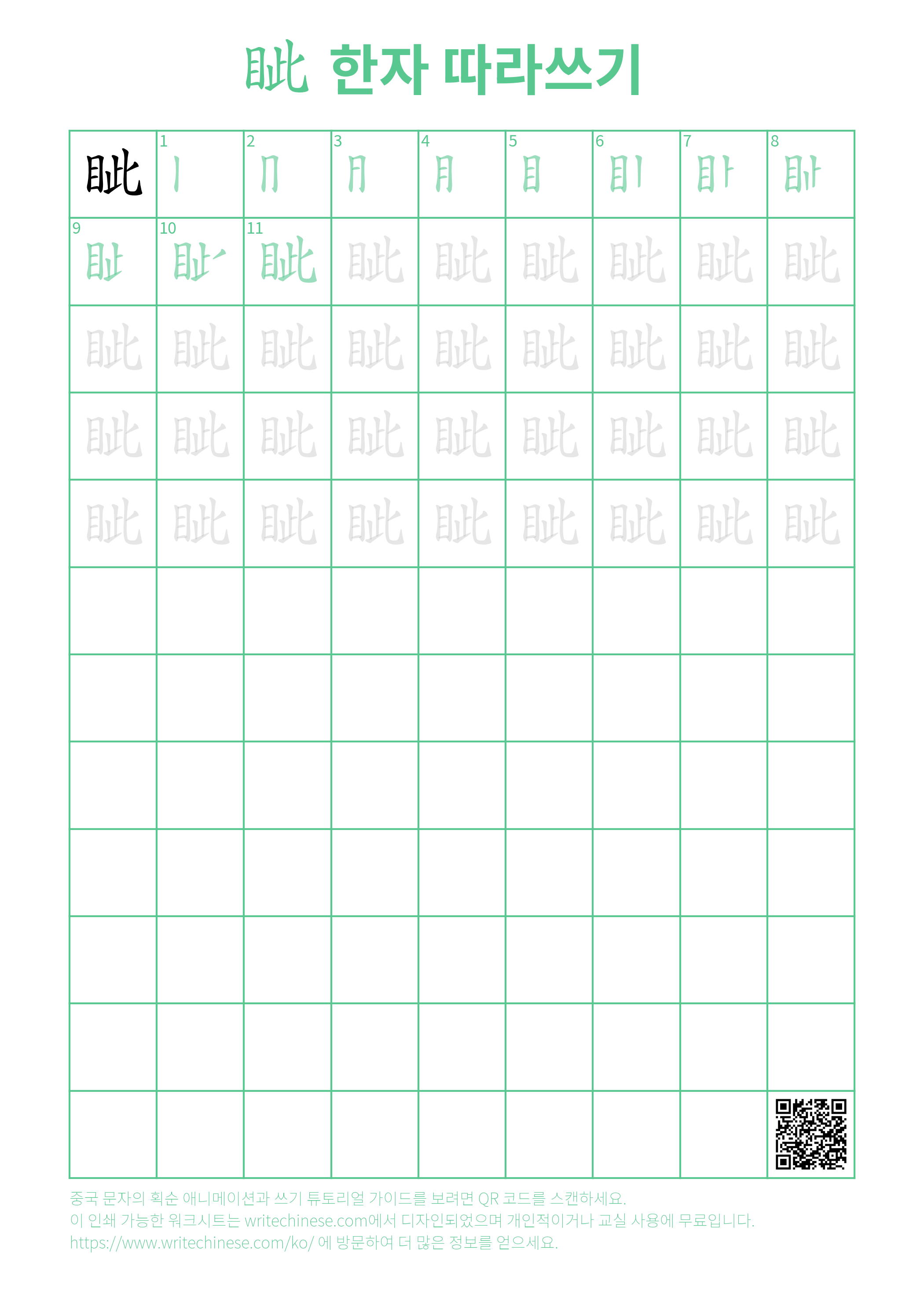 眦의 획순 연습용 인쇄 가능한 연습지입니다