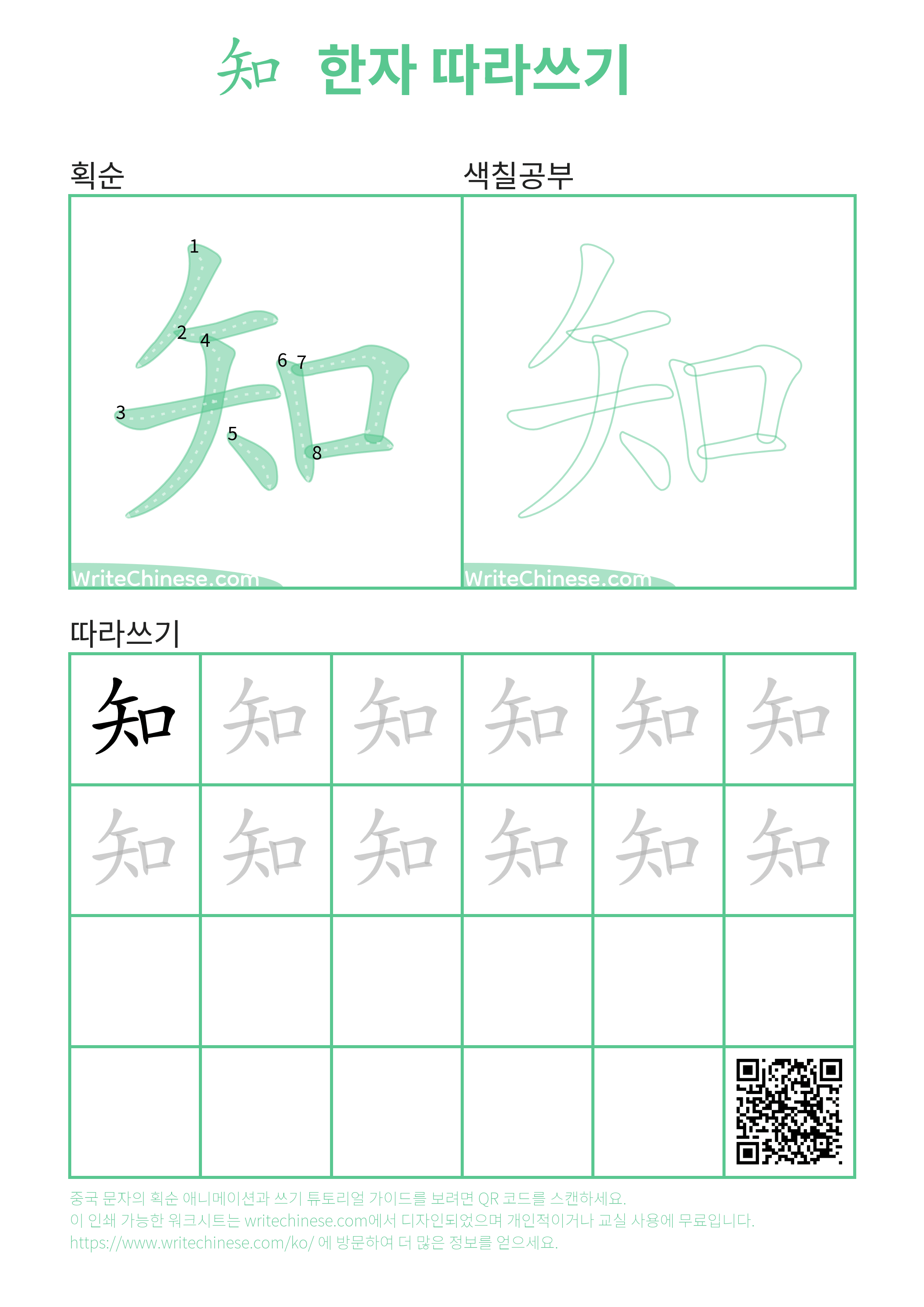 글씨 대가를 따라가며 '知' 문자를 단계별로 쓰는 방법을 익혀 보세요. 캘리그라피 선생님과 함께하는 비디오 튜토리얼을 통해 중국 문자 '知'의 올바른 쓰기 방법을 배울 수 있습니다. 아래 링크에서 인쇄용 필기 연습지를 다운로드하여 종이와 펜과 함께 연습해 보세요.