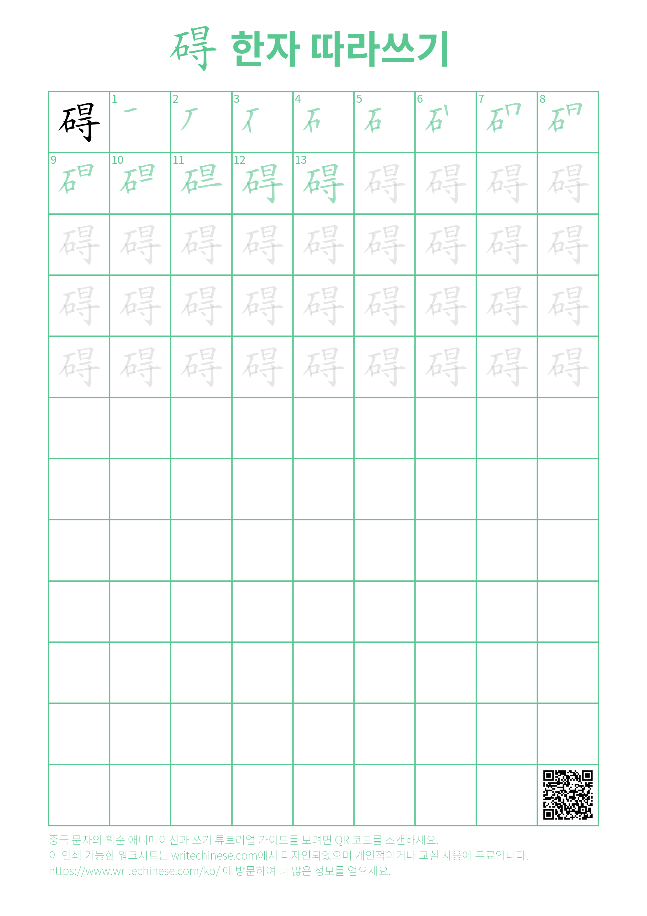 글씨 대가를 따라가며 '碍' 문자를 단계별로 쓰는 방법을 익혀 보세요. 캘리그라피 선생님과 함께하는 비디오 튜토리얼을 통해 중국 문자 '碍'의 올바른 쓰기 방법을 배울 수 있습니다. 아래 링크에서 인쇄용 필기 연습지를 다운로드하여 종이와 펜과 함께 연습해 보세요.
