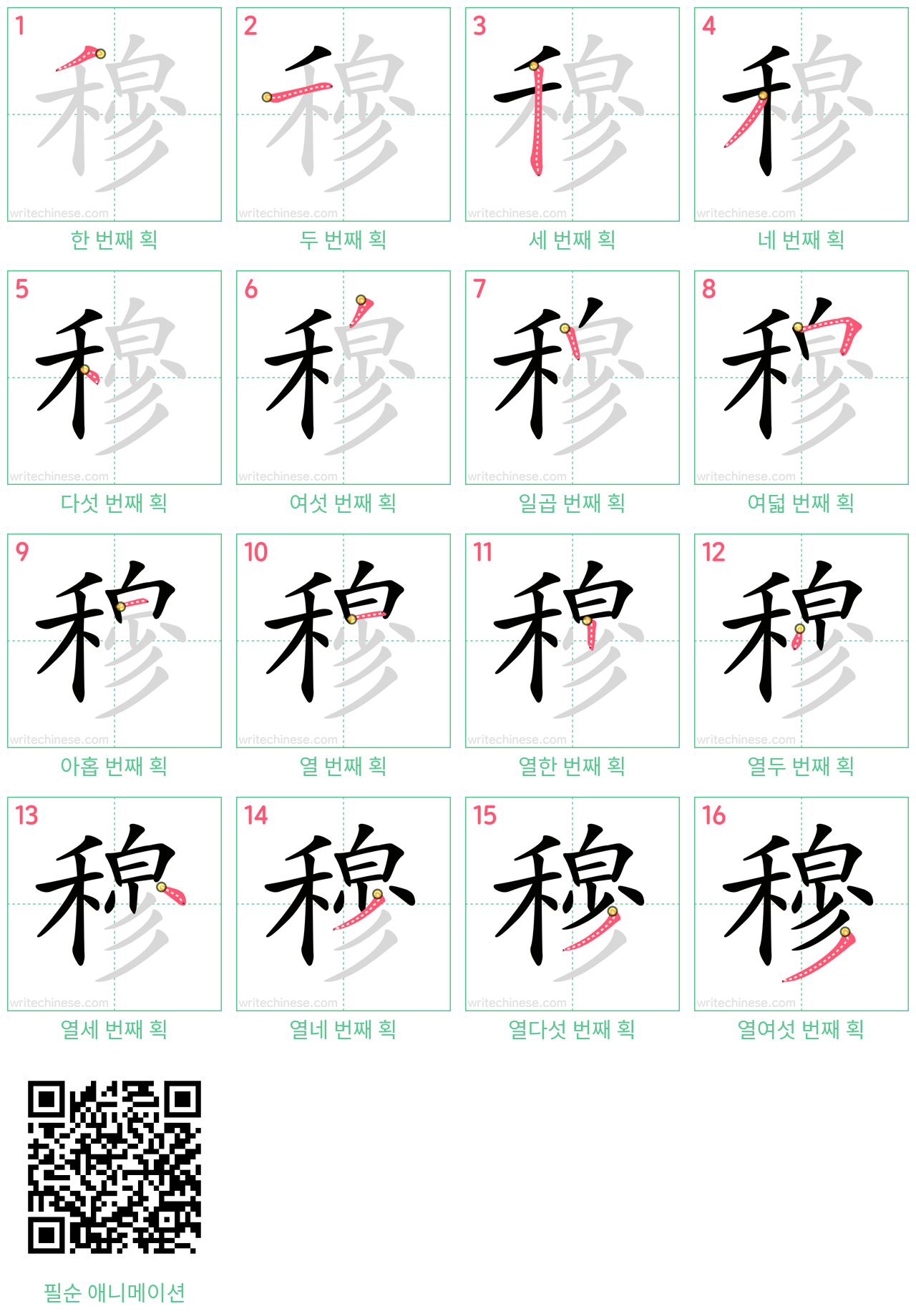 한 획 한 획: 穆의 쓰기 순서. 시각적인 단계별 안내를 통해 중국 문자 '穆'의 획을 하나씩 익혀 보세요.