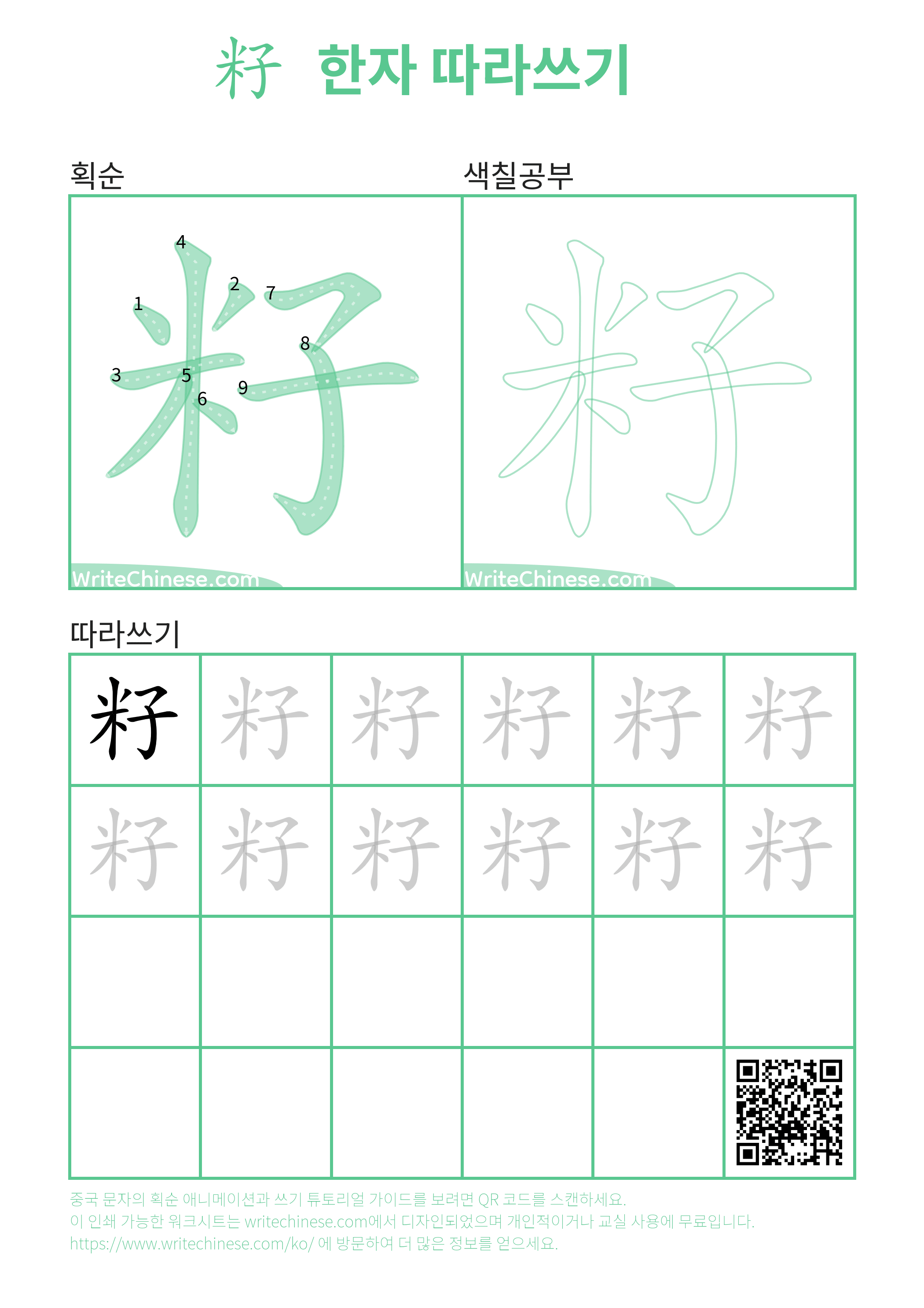 籽의 획순 연습용 인쇄 가능한 연습지입니다