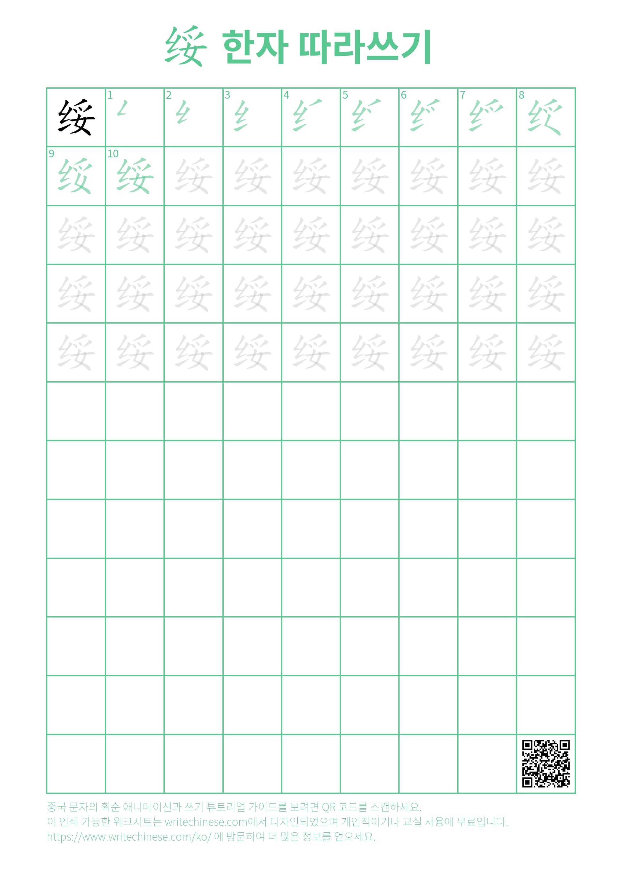 한 획 한 획: 绥의 쓰기 순서. 시각적인 단계별 안내를 통해 중국 문자 '绥'의 획을 하나씩 익혀 보세요.