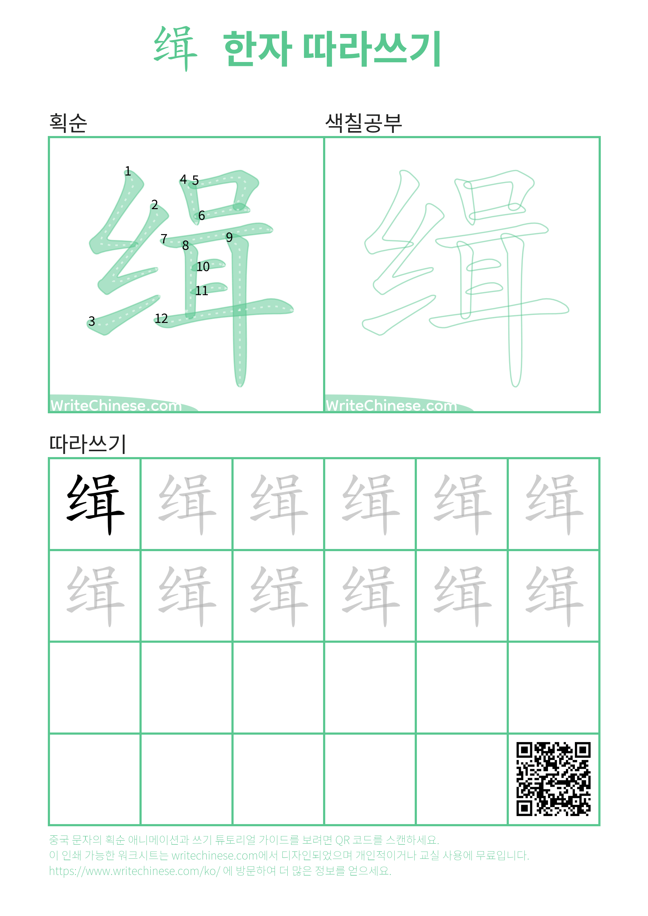 缉의 획순 연습용 인쇄 가능한 연습지입니다