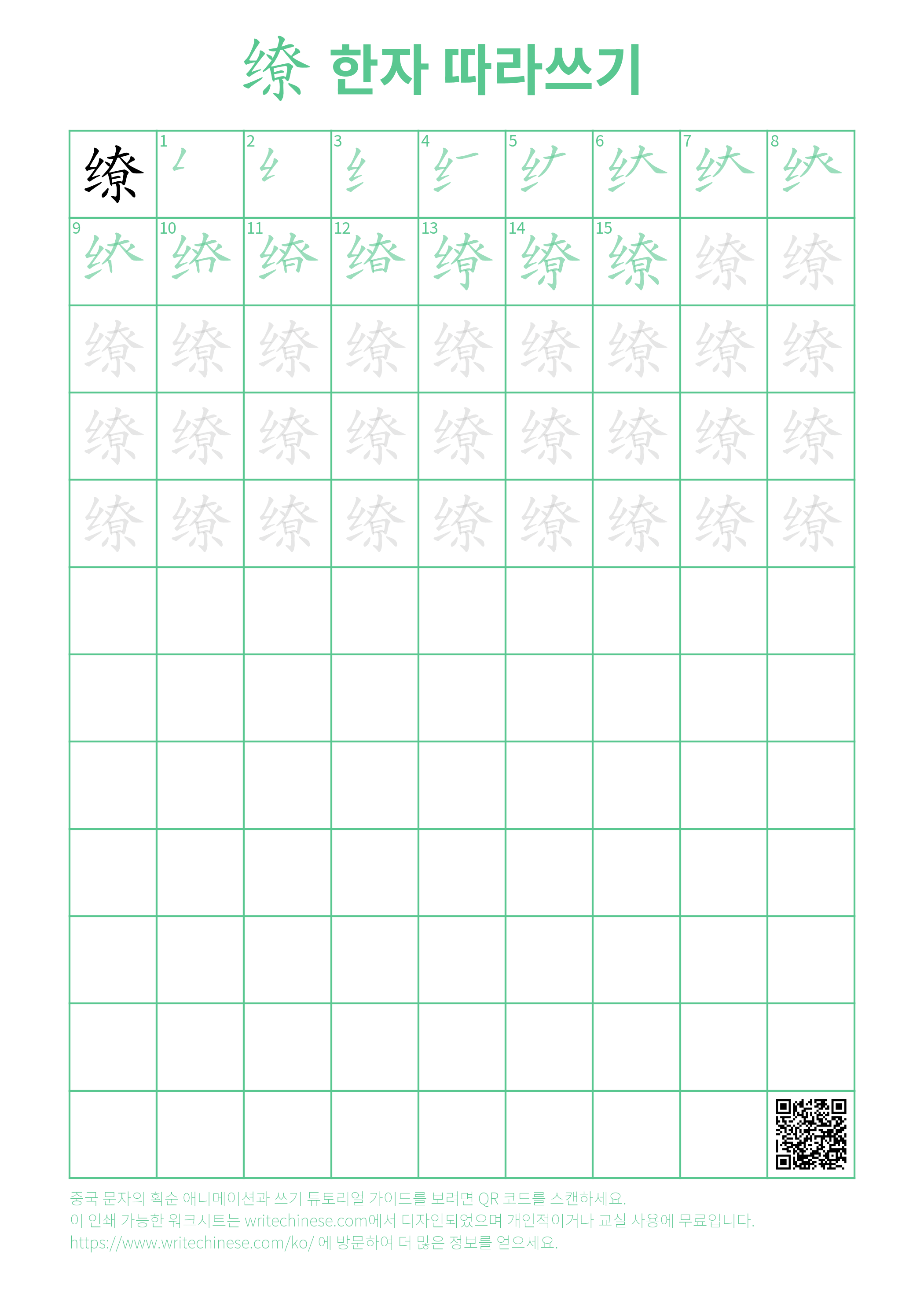 한 획 한 획: 缭의 쓰기 순서. 시각적인 단계별 안내를 통해 중국 문자 '缭'의 획을 하나씩 익혀 보세요.