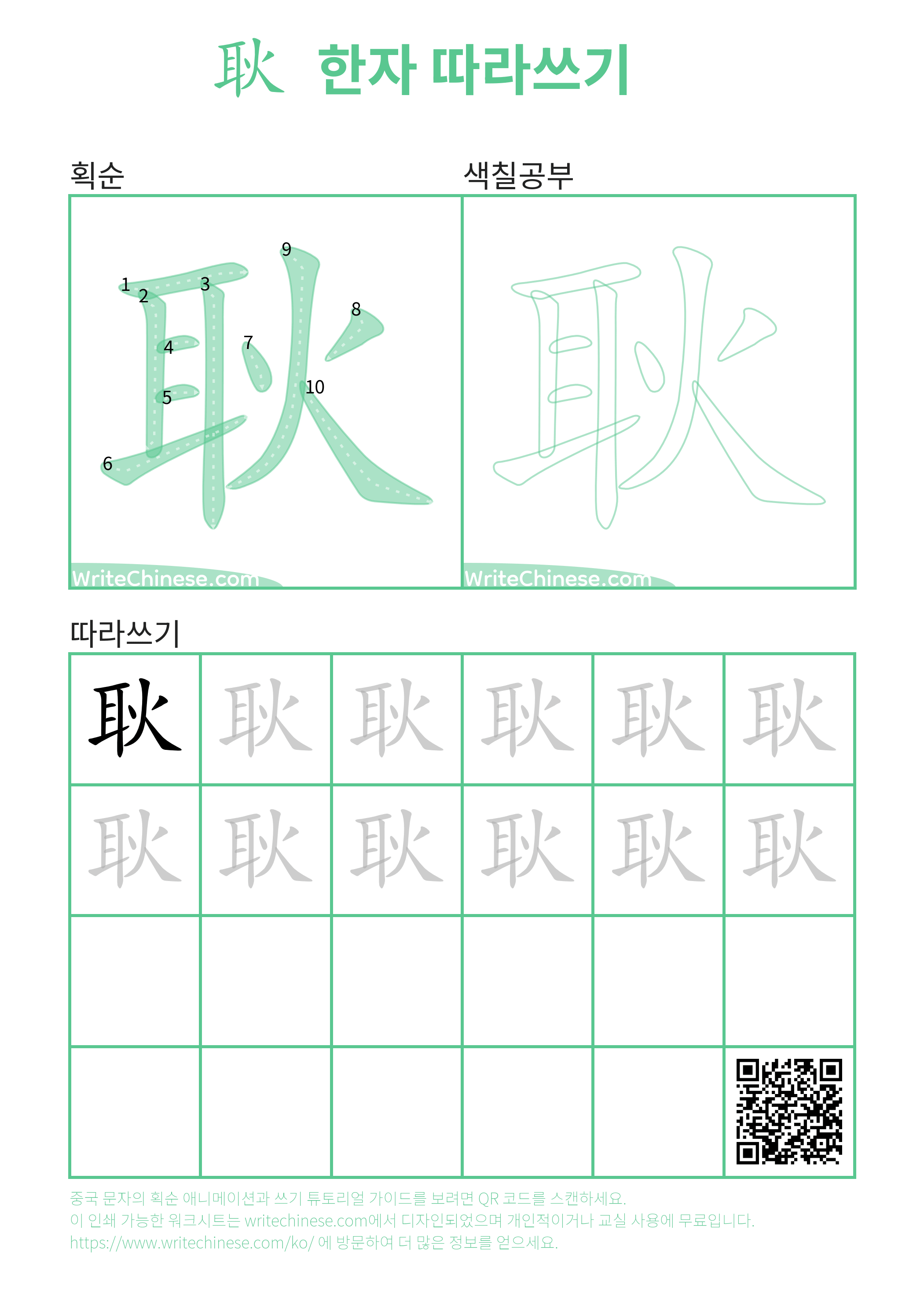 耿의 획순 연습용 인쇄 가능한 연습지입니다