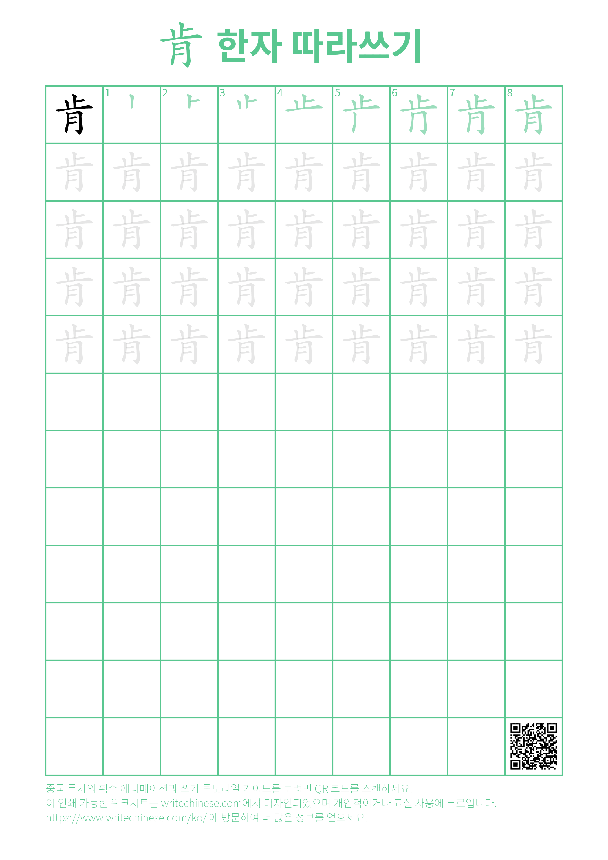 한 획 한 획: 肯의 쓰기 순서. 시각적인 단계별 안내를 통해 중국 문자 '肯'의 획을 하나씩 익혀 보세요.