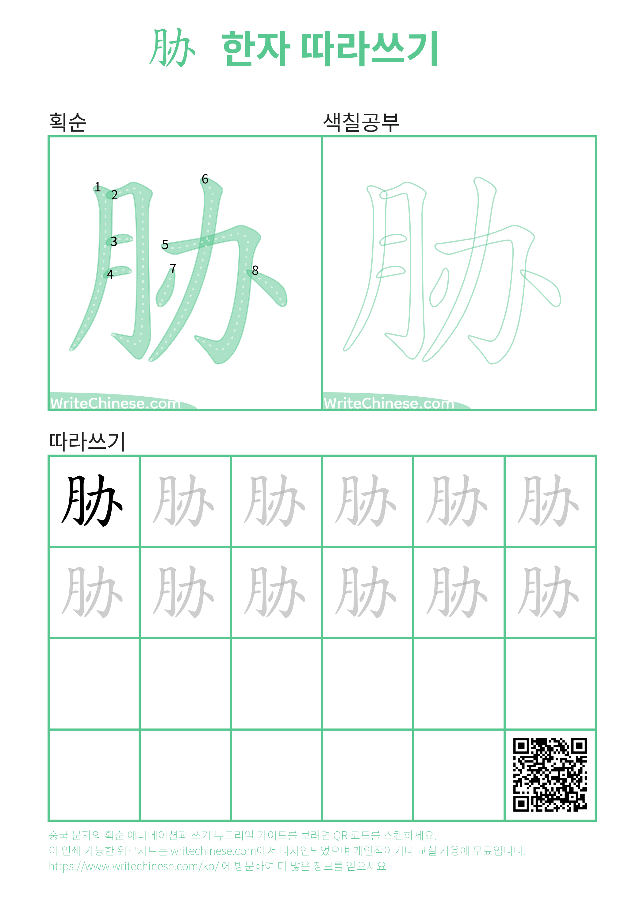 "胁"의 획순 애니메이션을 보면서 중국 문자 "胁"을 쓰는 법을 배워 보세요.