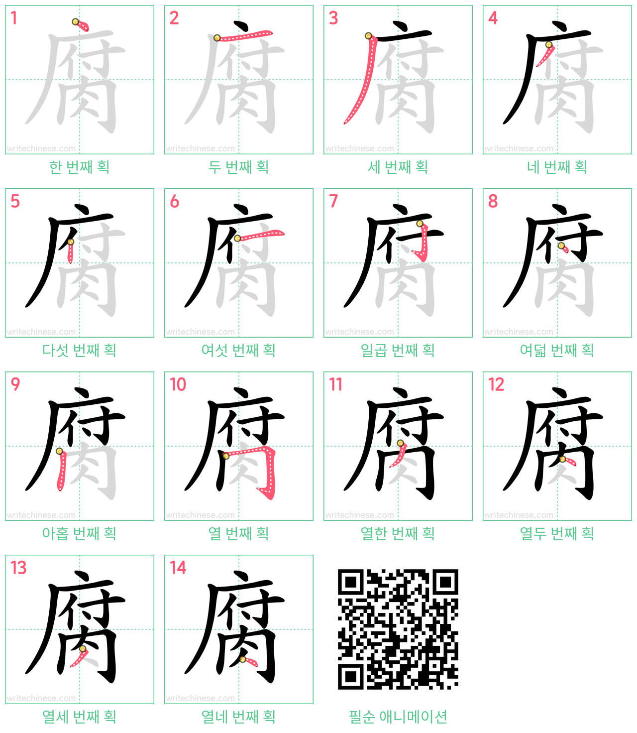 한 획 한 획: 腐의 쓰기 순서. 시각적인 단계별 안내를 통해 중국 문자 '腐'의 획을 하나씩 익혀 보세요.