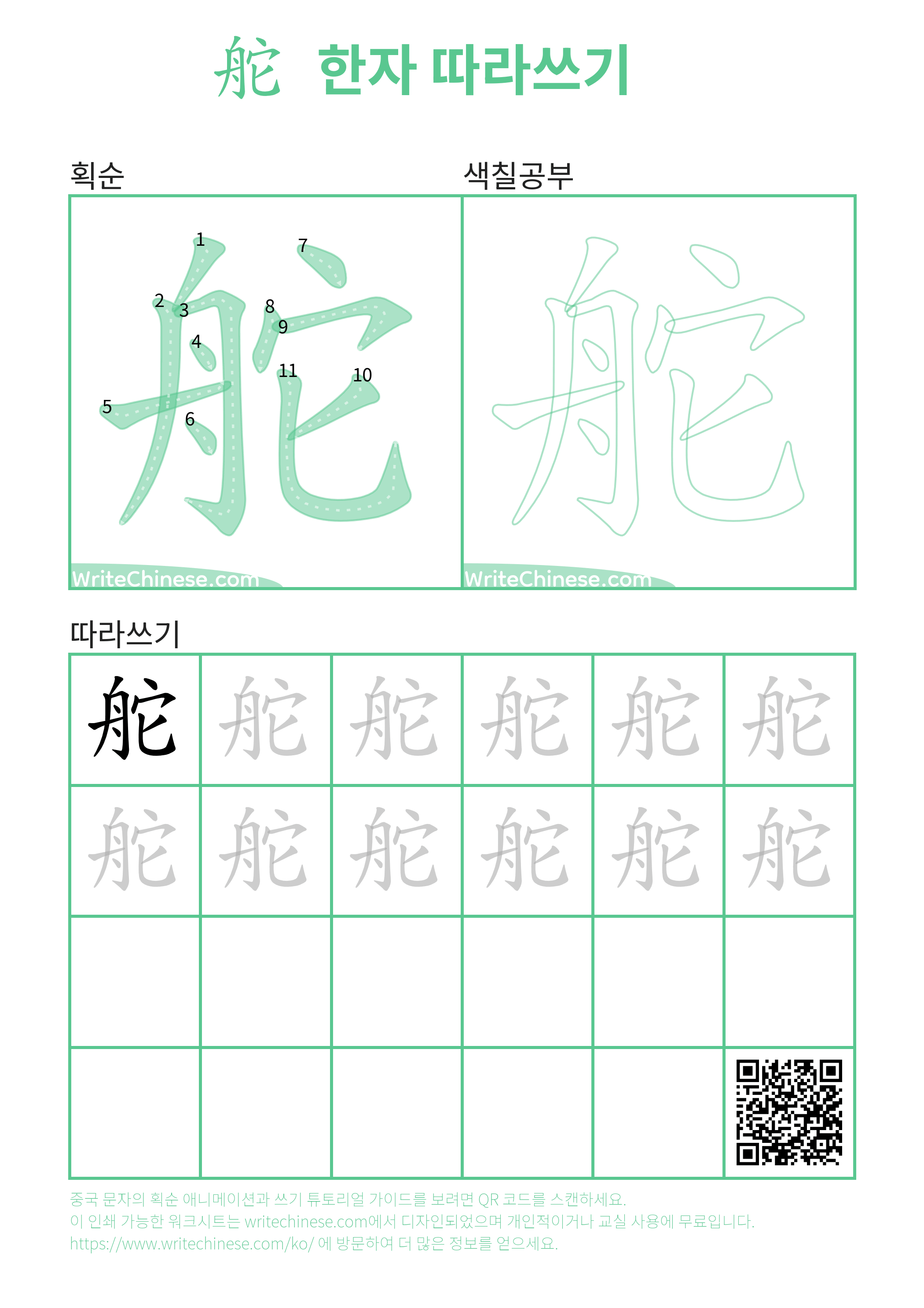 "舵"의 획순 애니메이션을 보면서 중국 문자 "舵"을 쓰는 법을 배워 보세요.