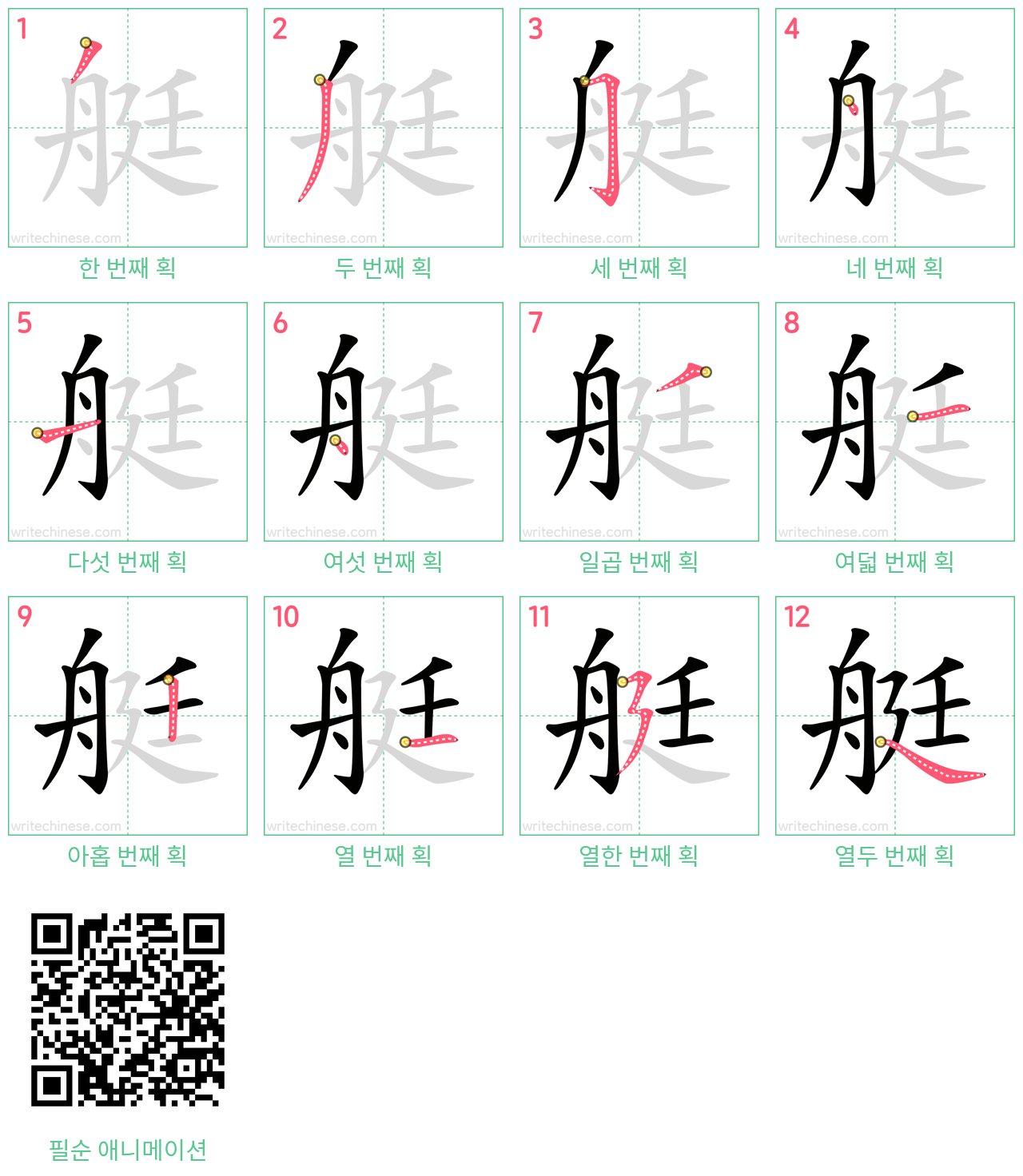 한 획 한 획: 艇의 쓰기 순서. 시각적인 단계별 안내를 통해 중국 문자 '艇'의 획을 하나씩 익혀 보세요.