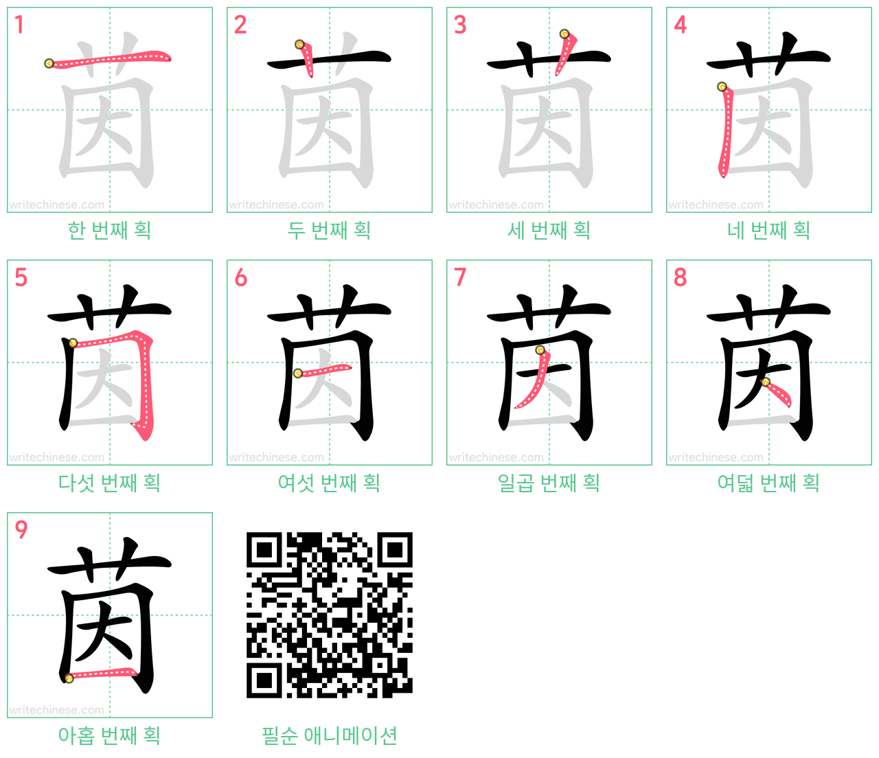 한 획 한 획: 茵의 쓰기 순서. 시각적인 단계별 안내를 통해 중국 문자 '茵'의 획을 하나씩 익혀 보세요.