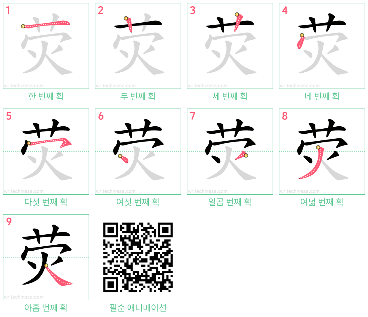 "荧"의 획순 애니메이션을 보면서 중국 문자 "荧"을 쓰는 법을 배워 보세요.