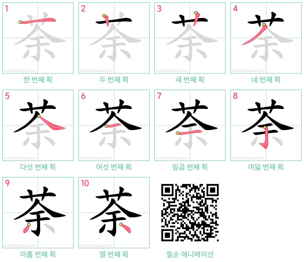 "荼"의 획순 애니메이션을 보면서 중국 문자 "荼"을 쓰는 법을 배워 보세요.