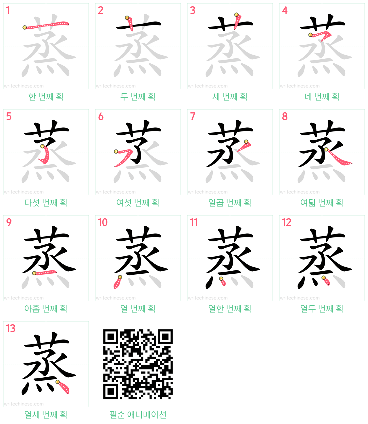 "蒸"의 획순 애니메이션을 보면서 중국 문자 "蒸"을 쓰는 법을 배워 보세요.