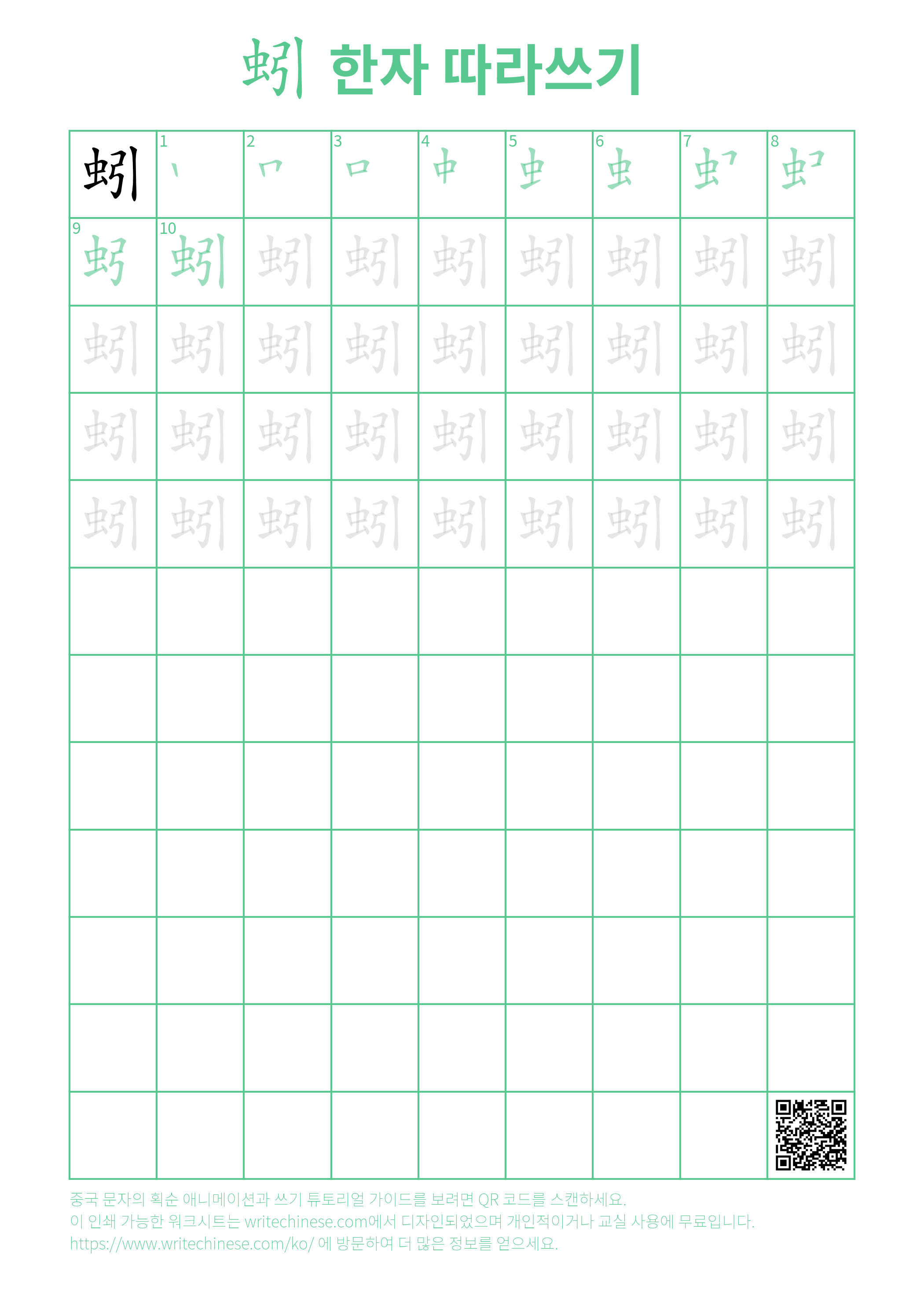 한 획 한 획: 蚓의 쓰기 순서. 시각적인 단계별 안내를 통해 중국 문자 '蚓'의 획을 하나씩 익혀 보세요.