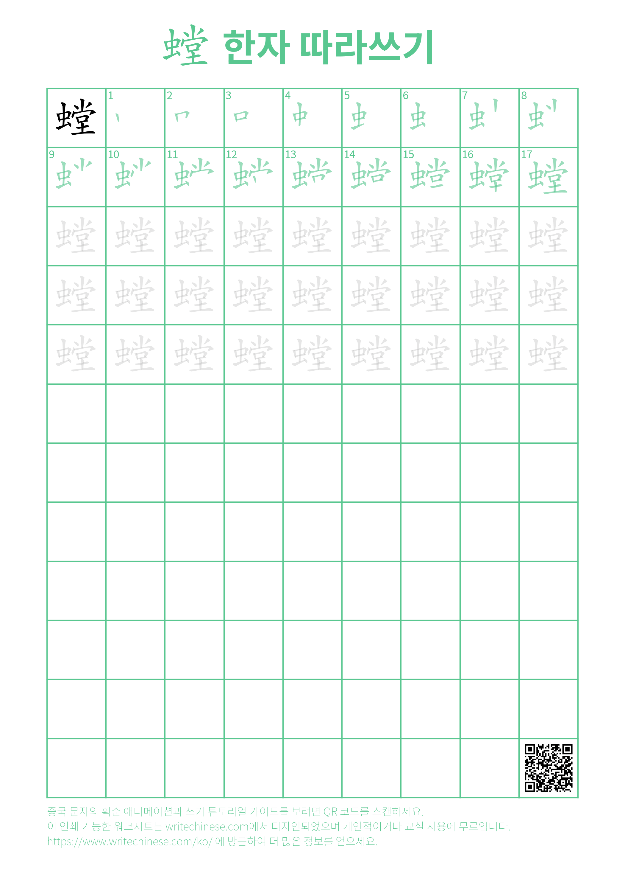 글씨 대가를 따라가며 '螳' 문자를 단계별로 쓰는 방법을 익혀 보세요. 캘리그라피 선생님과 함께하는 비디오 튜토리얼을 통해 중국 문자 '螳'의 올바른 쓰기 방법을 배울 수 있습니다. 아래 링크에서 인쇄용 필기 연습지를 다운로드하여 종이와 펜과 함께 연습해 보세요.