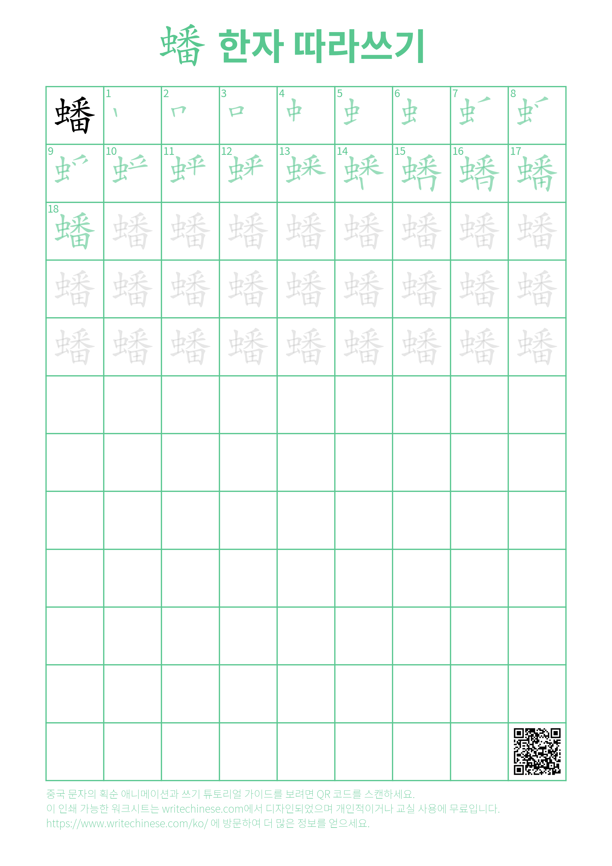 한 획 한 획: 蟠의 쓰기 순서. 시각적인 단계별 안내를 통해 중국 문자 '蟠'의 획을 하나씩 익혀 보세요.
