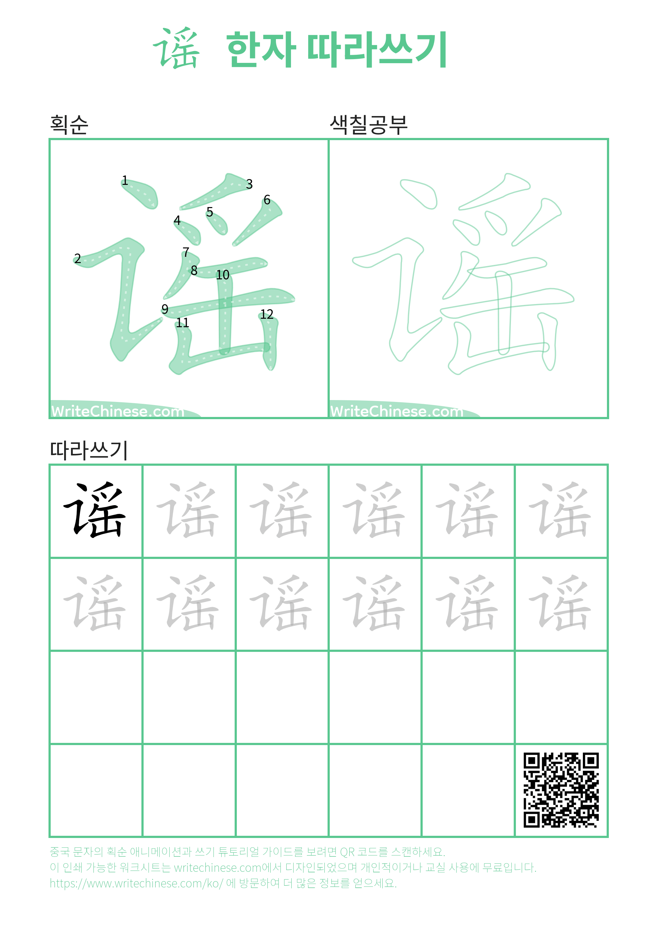 "谣"의 획순 애니메이션을 보면서 중국 문자 "谣"을 쓰는 법을 배워 보세요.