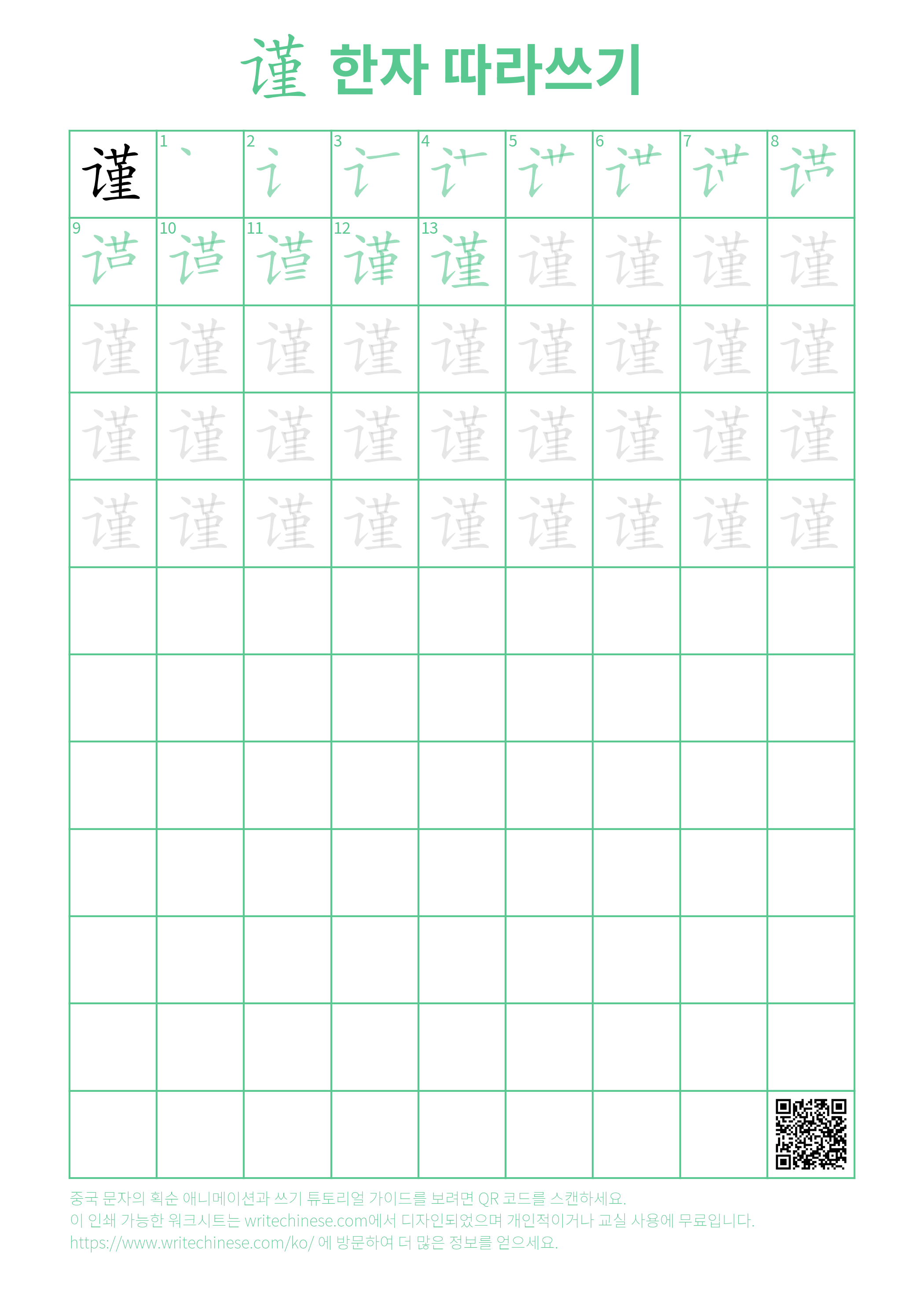 한 획 한 획: 谨의 쓰기 순서. 시각적인 단계별 안내를 통해 중국 문자 '谨'의 획을 하나씩 익혀 보세요.