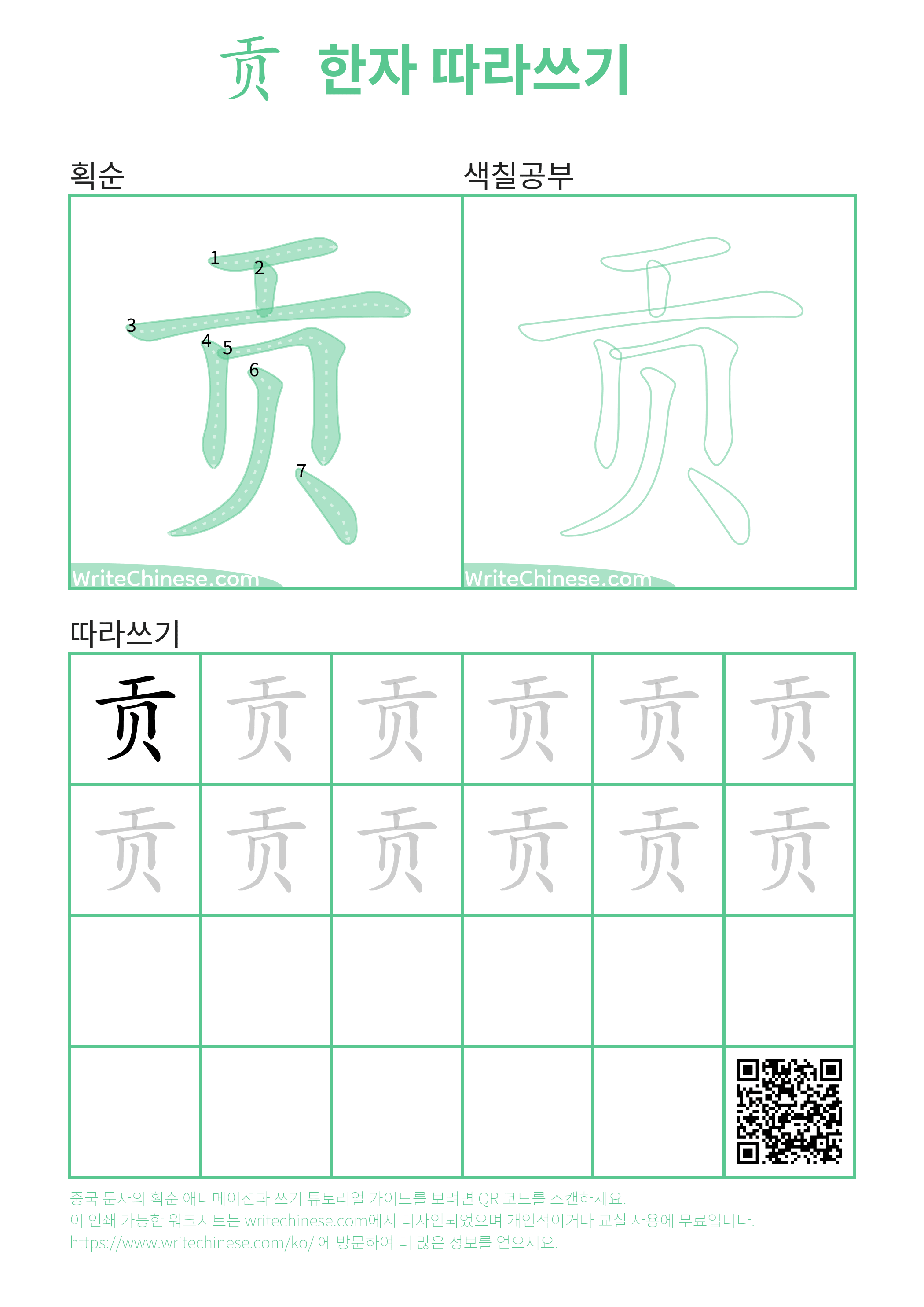 한 획 한 획: 贡의 쓰기 순서. 시각적인 단계별 안내를 통해 중국 문자 '贡'의 획을 하나씩 익혀 보세요.