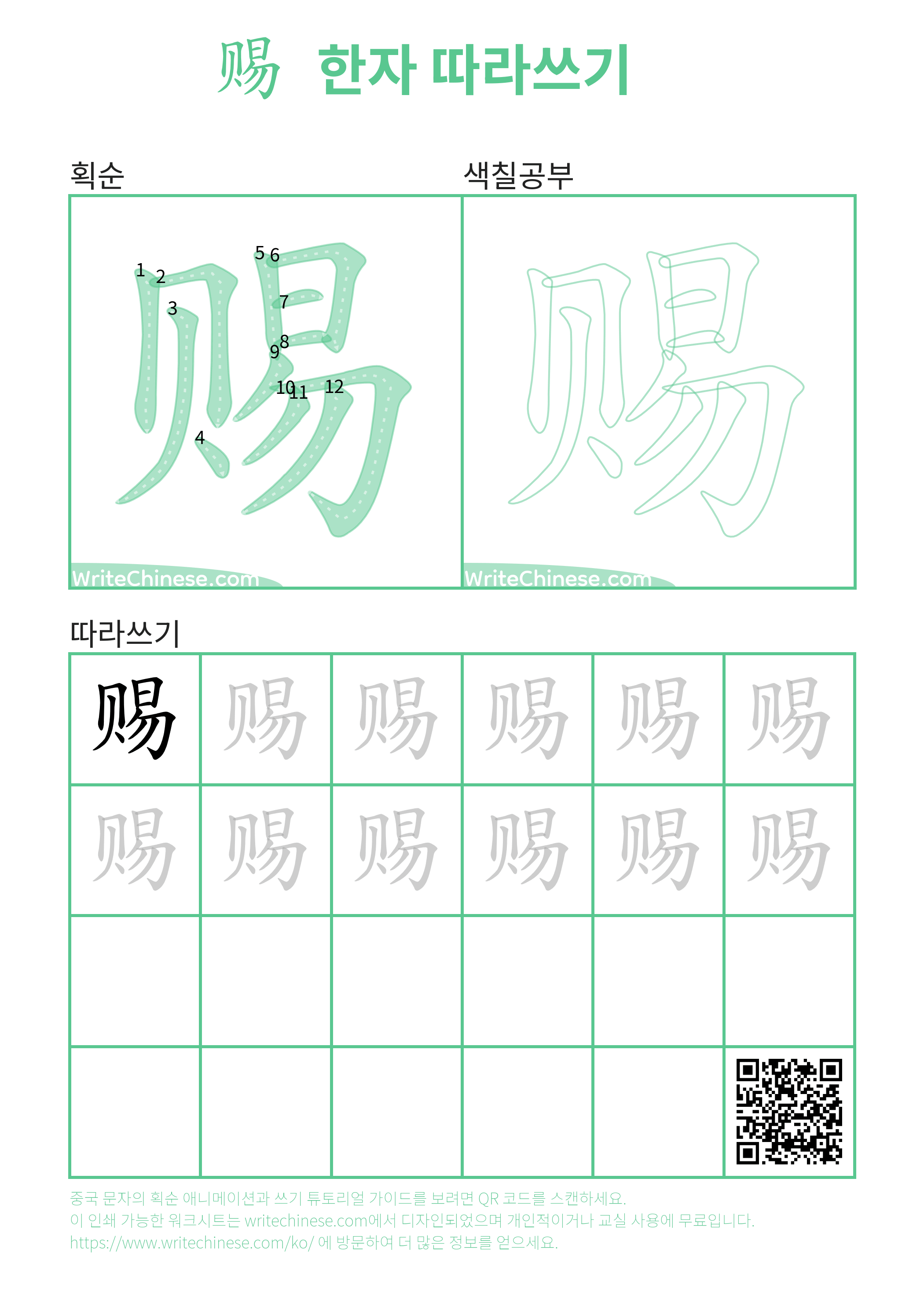 赐의 획순 연습용 인쇄 가능한 연습지입니다