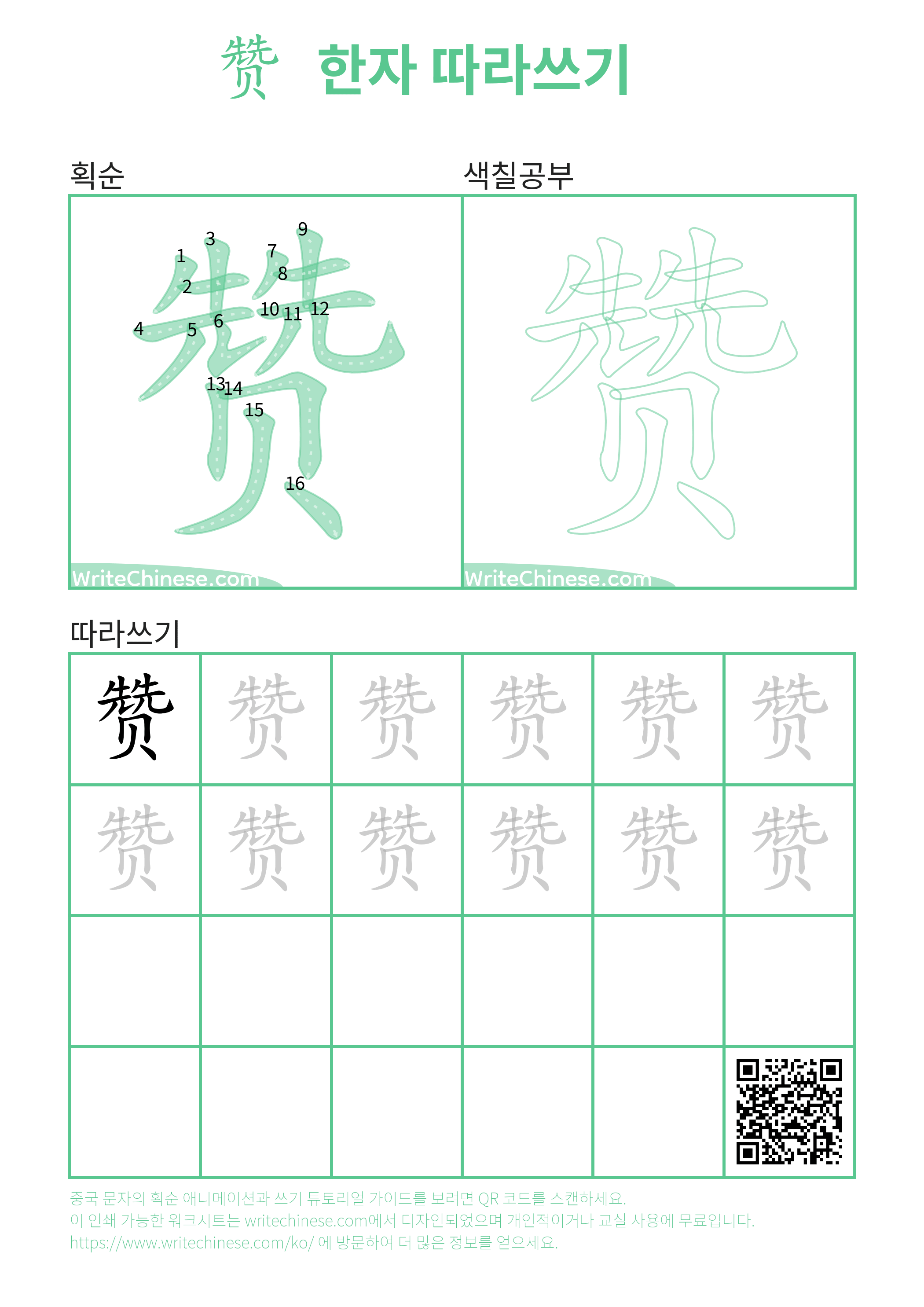 한 획 한 획: 赞의 쓰기 순서. 시각적인 단계별 안내를 통해 중국 문자 '赞'의 획을 하나씩 익혀 보세요.