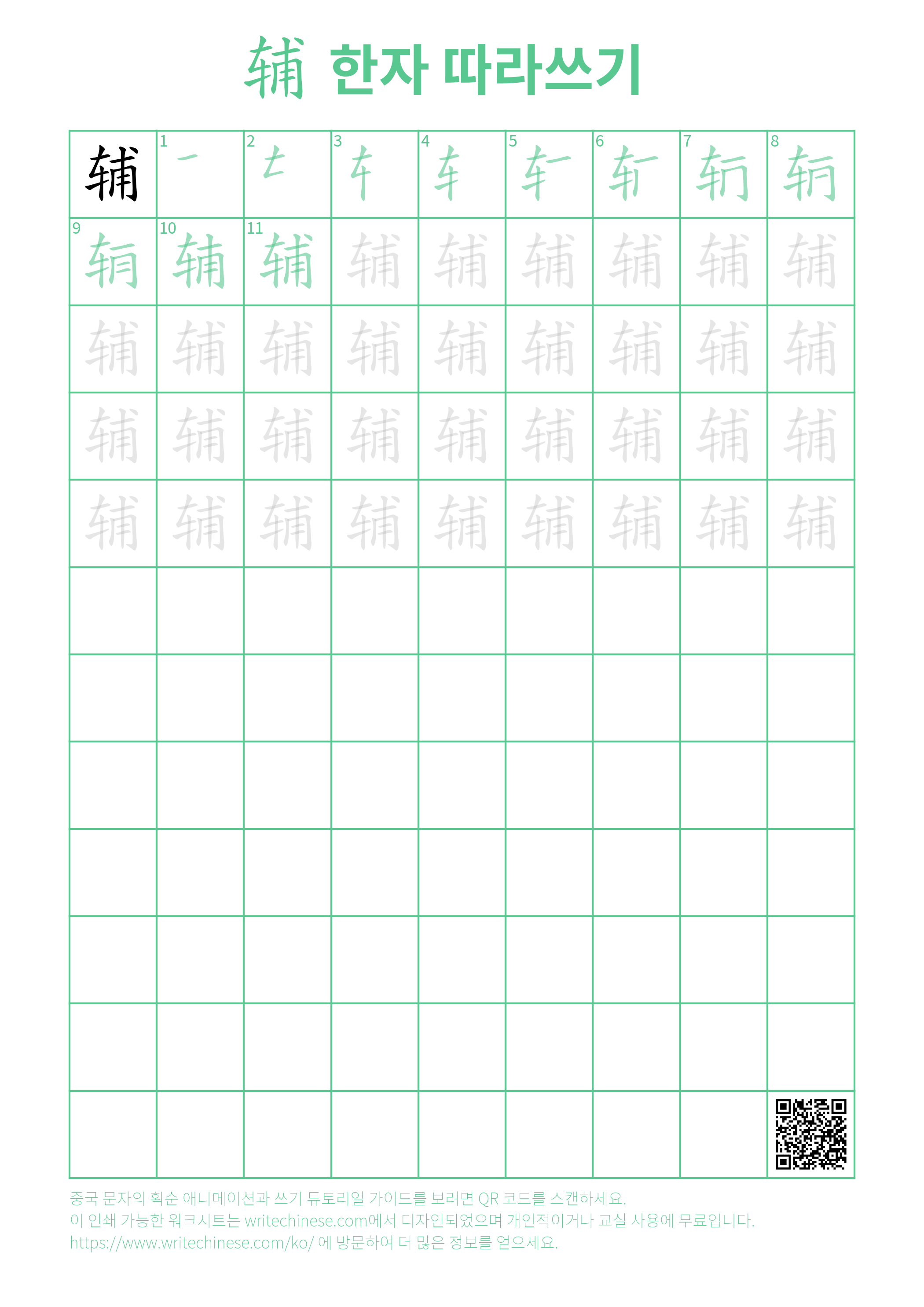 한 획 한 획: 辅의 쓰기 순서. 시각적인 단계별 안내를 통해 중국 문자 '辅'의 획을 하나씩 익혀 보세요.