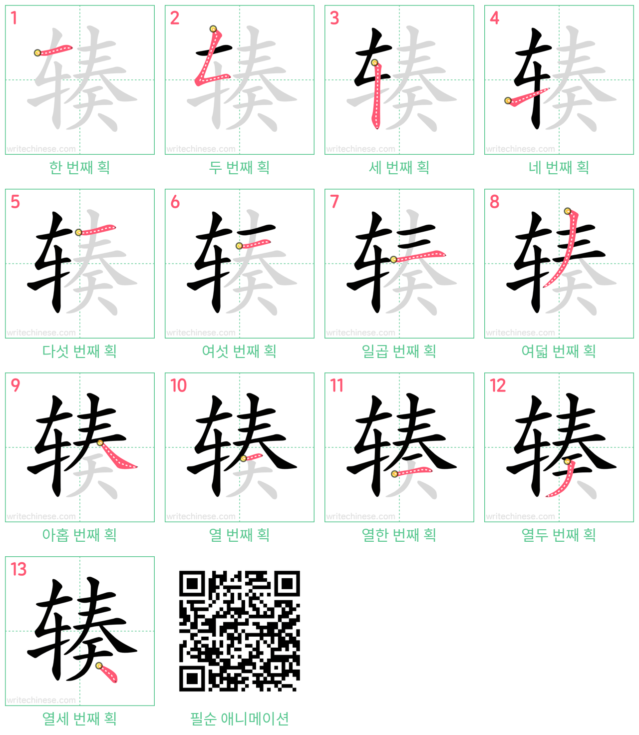 한 획 한 획: 辏의 쓰기 순서. 시각적인 단계별 안내를 통해 중국 문자 '辏'의 획을 하나씩 익혀 보세요.